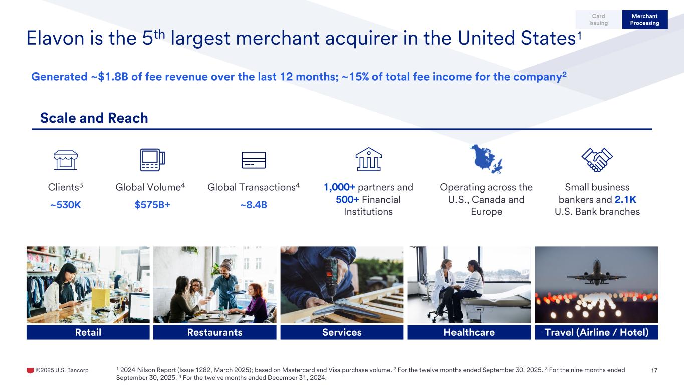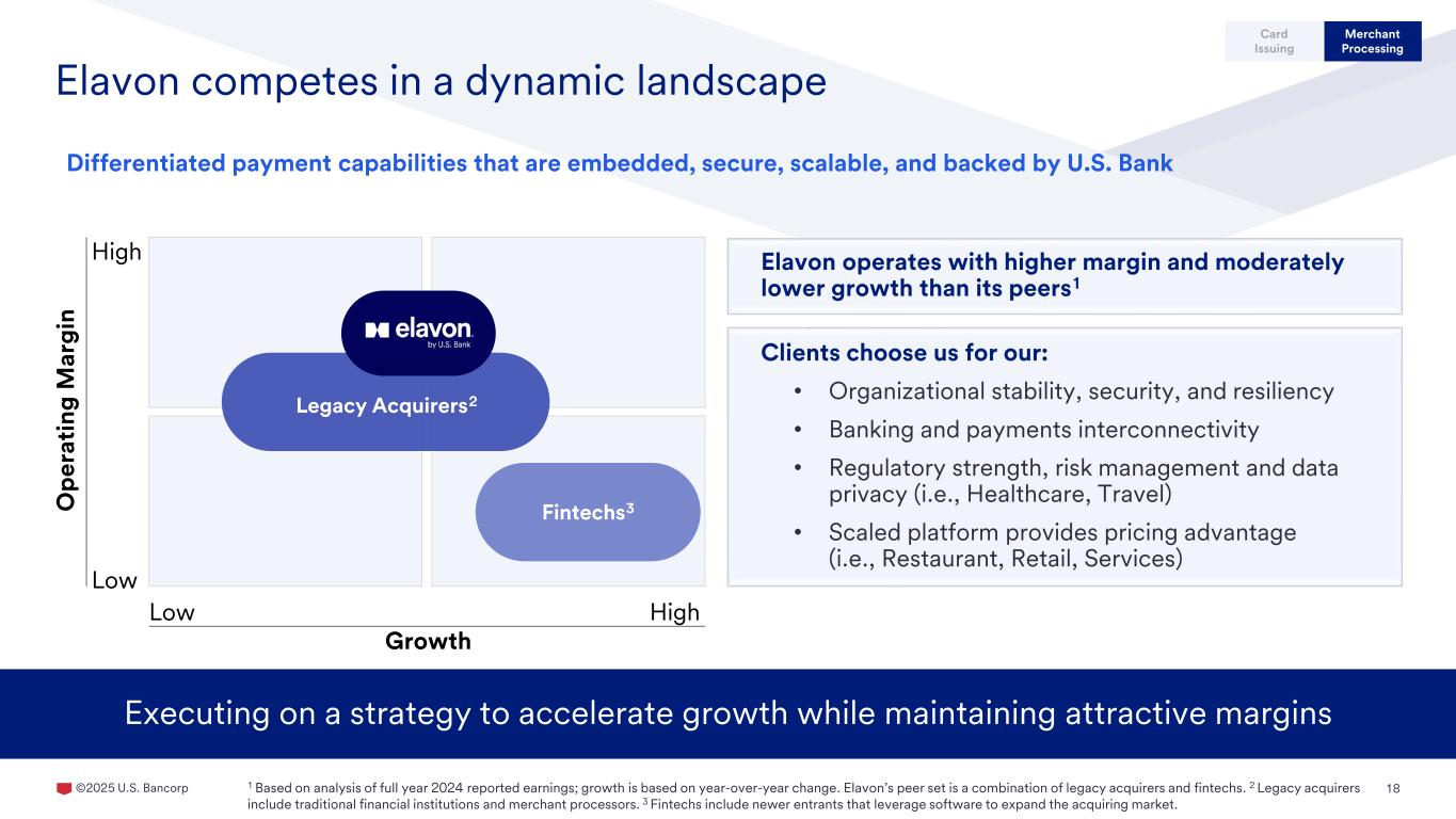 ©2025 美国合众银行 17 Elavon是美国第5大商户收单机构1在过去12个月中产生了约$ 1.8B的手续费收入;约占公司总手续费收入的15% 2小企业银行家和2.1K美国银行分支机构客户3全球交易4Global Volume4 $ 575B +~530K~8.4B在美国、加拿大和欧洲运营1,000 +合作伙伴和500 + 金融机构规模化并达到零售医疗保健旅行(航空公司/酒店)餐厅服务12024 Nilson Report(Issue 1282,March 2025);基于万事达和Visa购买量。2截至2025年9月30日止十二个月。3截至2025年9月30日止九个月。4截至2024年12月31日止十二个月。发卡商户办理