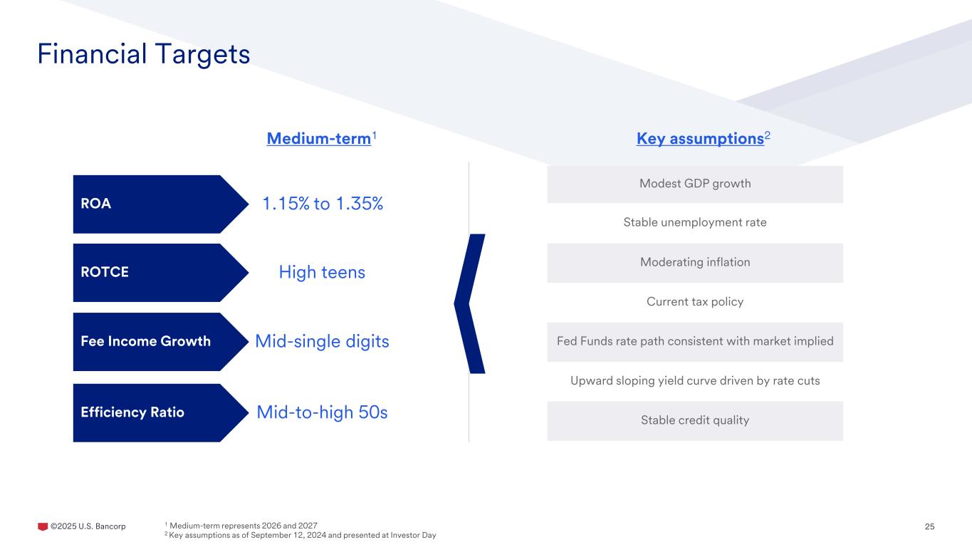 ©2025 美国合众银行 25项财务目标ROA ROTCE手续费收入增长效率比1.15%至1.35%高青少年中个位数50年代中期至高50年代中期1关键假设2 GDP温和增长稳定失业率缓和通胀当前税收政策联邦基金利率路径与市场一致隐含的由降息驱动的向上倾斜的收益率曲线稳定的信贷质量1中期代表2026年和2027年2截至2024年9月12日并在投资者日上呈现的关键假设