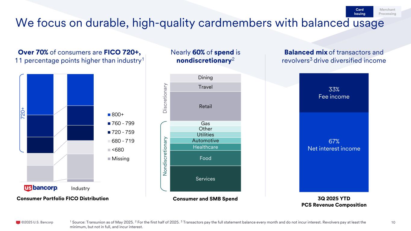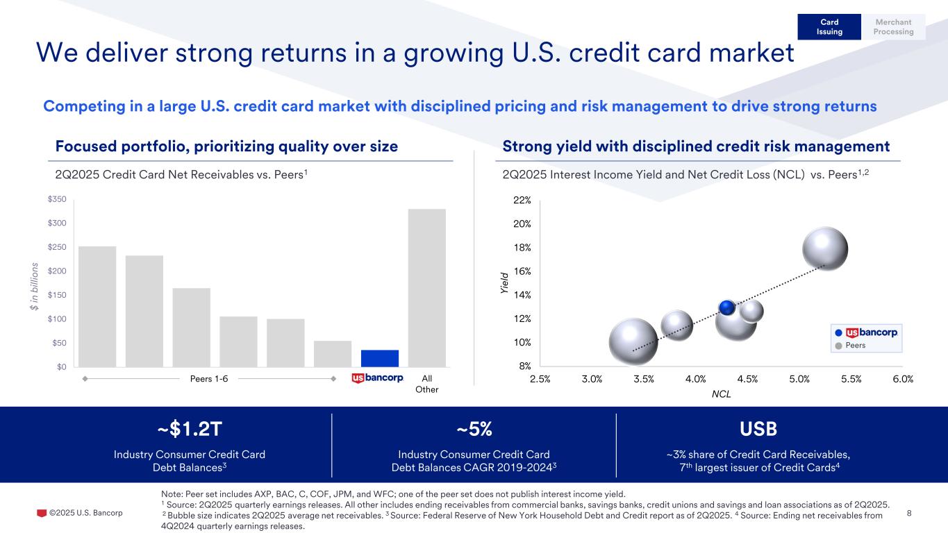©2025 美国合众银行 88.8% 10% 12% 14% 16% 18% 20% 22% 2.5% 3.0% 3.5% 4.0% 4.5% 5.0% 5.5% 6.0% Yi el d NCL $ 0 $ 50 $ 100 $ 150 $ 200 $ 250 $ 300 $ 350 Peer Peer Peer Peer Peer USB All Other我们在不断增长的美国信用卡市场中提供强劲的回报,在美国大型信用卡市场中竞争,以严格的定价和风险管理推动强劲回报为重点的投资组合,质量优先于规模2025年第二季度信用卡应收账款净额vs.同业1收益率强劲,信用风险管理严格,2025年第二季度利息收入收益率和净信用损失(NCL)vs.同业1,2注:同业集包括AXP、BAC、C、COF、JPM、WFC;其中一个同业集不公布利息收入收益率。1资料来源:2025年第二季度季度收益发布。所有其他包括截至2025年第二季度商业银行、储蓄银行、信用合作社和储贷协会的期末应收账款。2气泡大小表示2025年第二季度平均应收账款净额。3资料来源:美联储截至2025年第二季度的纽约家庭债务和信用报告。4资料来源:2024年第四季度季度收益发布的期末应收账款净额。~$ 1.2T~5% USB行业消费者信用卡债务余额3行业消费者信用卡债务余额CAGR 2019-20243~3%信用卡应收账款份额,第7大信用卡发行商4发卡商处理$ in b ill io ns peers 1-6 peers