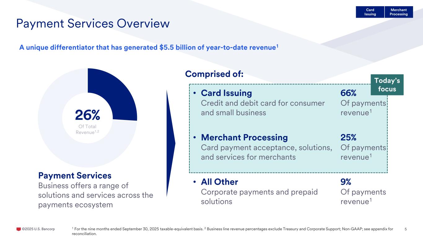 ©2025 美国合众银行 5支付服务概览占总收入的26% 1,2支付服务业务在整个支付生态系统中提供一系列解决方案和服务,包括:•面向消费者和小型企业的发卡信用卡和借记卡支付收入的66% 1 •商户处理卡支付接受、解决方案和面向商户的服务支付收入的25% 1 •所有其他企业支付和预付解决方案支付收入的9% 1今天的焦点发卡商户处理1截至2025年9月30日止九个月的应课税等值基础。2业务部门收入百分比不包括财务和企业支持;非公认会计原则;对账见附录。独特的差异化因素,年初至今创造了55亿美元的收入1