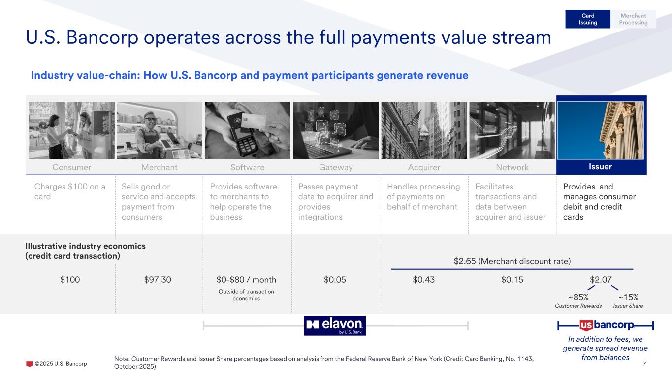 ©2025 美国合众银行 16 美国合众银行在整个支付价值流行业价值链中运营:美国合众银行和支付参与者如何产生收入消费者商家收单机构网络发行商Software Gateway对一张销售商品或服务的卡收取100美元的费用,并接受消费者的付款,从而代表商家处理付款,从而促进收单机构和发卡机构之间的交易和数据,为消费者的借记卡和信用卡提供和管理,为商家提供软件,以帮助运营企业将付款数据传递给收单机构并提供集成$ 100 $ 97.30 $ 0.43 $ 0.15 $ 2.07说明性行业经济学(信用卡交易)$ 2.65(商家折扣率)$ 0.05交易经济学之外$ 0-$ 80/月发卡商家处理注意:客户奖励和发卡机构份额百分比基于纽约联邦储备银行的分析(信用卡银行,第1143期,2025年10月)~85%客户奖励~15%发卡机构份额