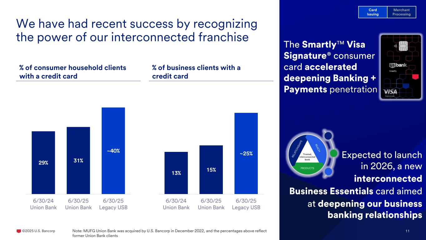 ©2025 美国合众银行 10我们专注于耐用、使用均衡的高品质持卡会员Q3 2025 YTD PCS收入构成USB行业消费者组合FICO分布800 + 760-799720-759680-719 < 680缺失超七成消费者为FICO 720 +,比行业高11个百分点1近60%的支出是非自由支配的2 N on di SC re tio na ry D is cr et io na ry 720 +交易方和左轮手枪的平衡组合3推动多元化收入服务食品医疗保健汽车公用事业其他燃气零售旅行餐饮消费者和SMB支出33%手续费收入67%净利息收入1资料来源:TransUnion截至2025年5月。2为2025年上半年。3交易方每月支付全部报表余额,不产生利息。左轮手枪至少支付最低金额,但不是全额支付,并产生利息。发卡商户办理