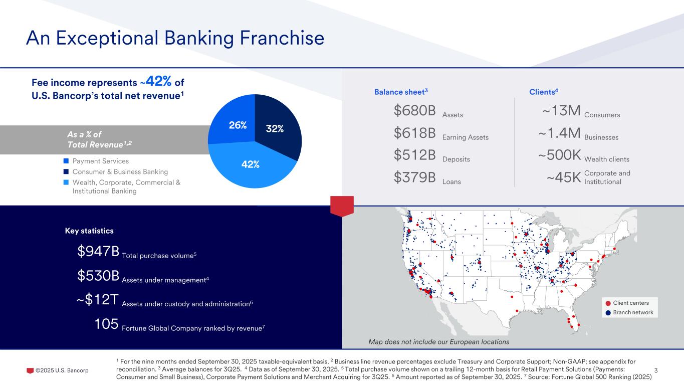 ©2025 美国合众银行 3一项特殊的银行业务占总收入的百分比1,2 ■支付服务■消费者和商业银行业务■财富、企业、商业和机构银行手续费收入约占美国合众银行总净收入的42% 1资产负债表3客户4 $ 680B资产~1300万消费者$ 618B收入资产~140万企业$ 512B存款~500k财富客户$ 379B贷款~45k企业和机构关键统计$ 947B总购买量5 $ 530B管理资产4~$ 12T托管和管理资产6105按收入排名的《财富》全球公司7客户中心分支机构网络地图不包括我们截至2025年9月30日止九个月的欧洲地区1的应税等值基础。2业务部门收入百分比不包括财务和企业支持;非公认会计原则;对账见附录。3第三季度平均余额25。4数据截至2025年9月30日。5零售支付解决方案(支付:消费者和小型企业)、企业支付解决方案和商家收单在过去12个月的基础上显示的总购买量为25年第三季度。6截至2025年9月30日报告的金额。7资料来源:《财富》世界500强排名(2025年)32% 42% 26%