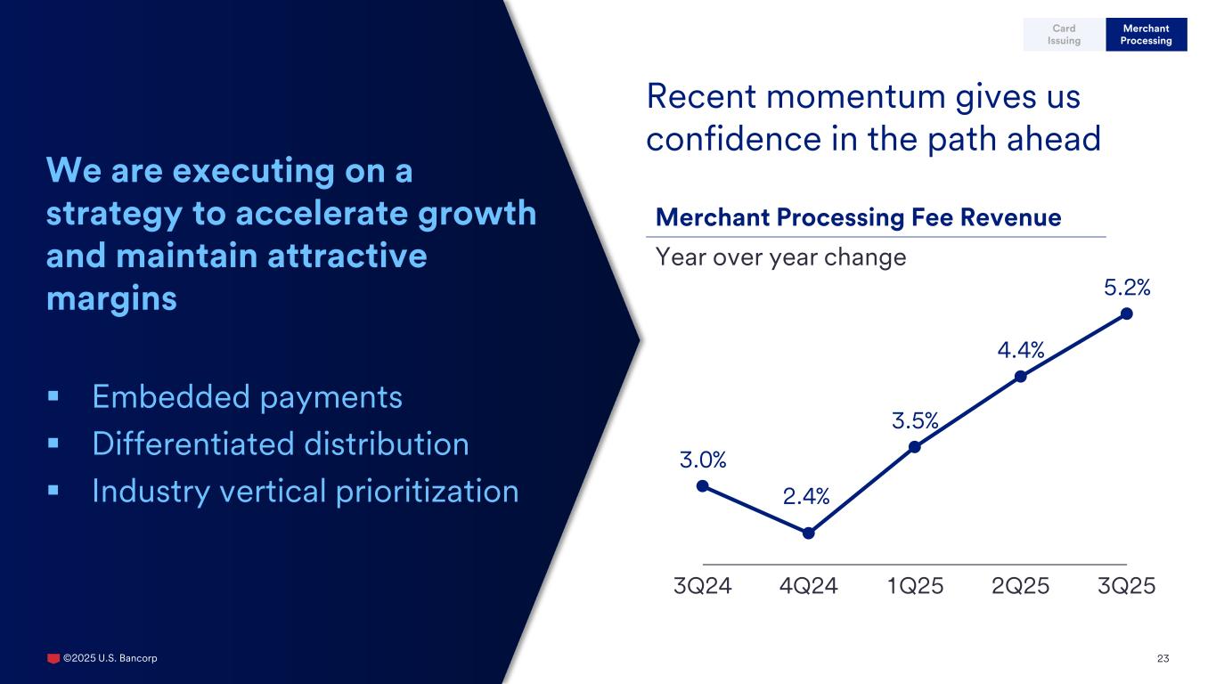 ©2025 美国合众银行 22行业垂直优先排序有针对性地投资于我们以银行+支付取胜的5个优先垂直领域3零售医疗保健旅行(航空公司/酒店)餐厅服务中小型企业(SMB)企业30%的收入111%的收入119%的收入112%的收入115%的收入115%的支付服务收入截至2025年9月30日止九个月的1%的收入。2截至2025年9月30日止九个月。32025年尼尔森报告评级。美国前10大酒店品牌中的7家3全球前10大航空公司中的8家3于2024年收购,以支持综合医疗保健支付talech于2019年收购,以支持小型企业与新的小型企业客户在业务要点方面的2倍渗透于2025年推出业务要点业务检查加talech势头强劲,签署了50 +份合同YTD2发卡商家处理