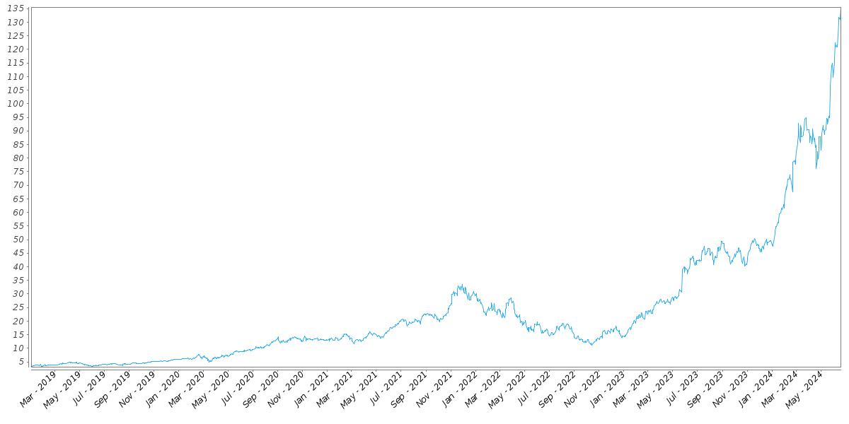 下图给出了自2019年1月2日至定价日期间,NVDA的日度历史表现。我们从Bloomberg L.P.获得了这一历史数据。我们未对从Bloomberg L.P.获得的信息的准确性或完整性进行独立验证。下图所反映的收盘市场价格可能已经调整,以反映某些公司行为,例如股票拆分和反向股票拆分。定价日,NVDA收盘市价为135.58美元。