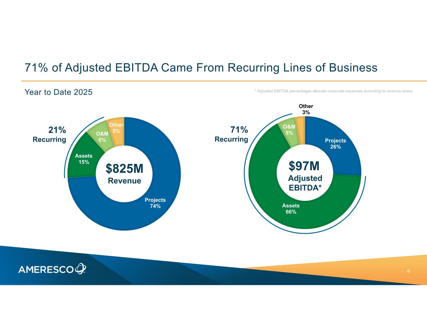 项目74%资产15% O & M 6%其他5% $ 8.25亿收入项目26%资产66% O & M 5%其他3% $ 9700万调整后EBITDA*71%的调整后EBITDA来自经常性业务4*调整后EBITDA百分比根据收入份额分配公司费用2025年迄今71%经常性21%经常性