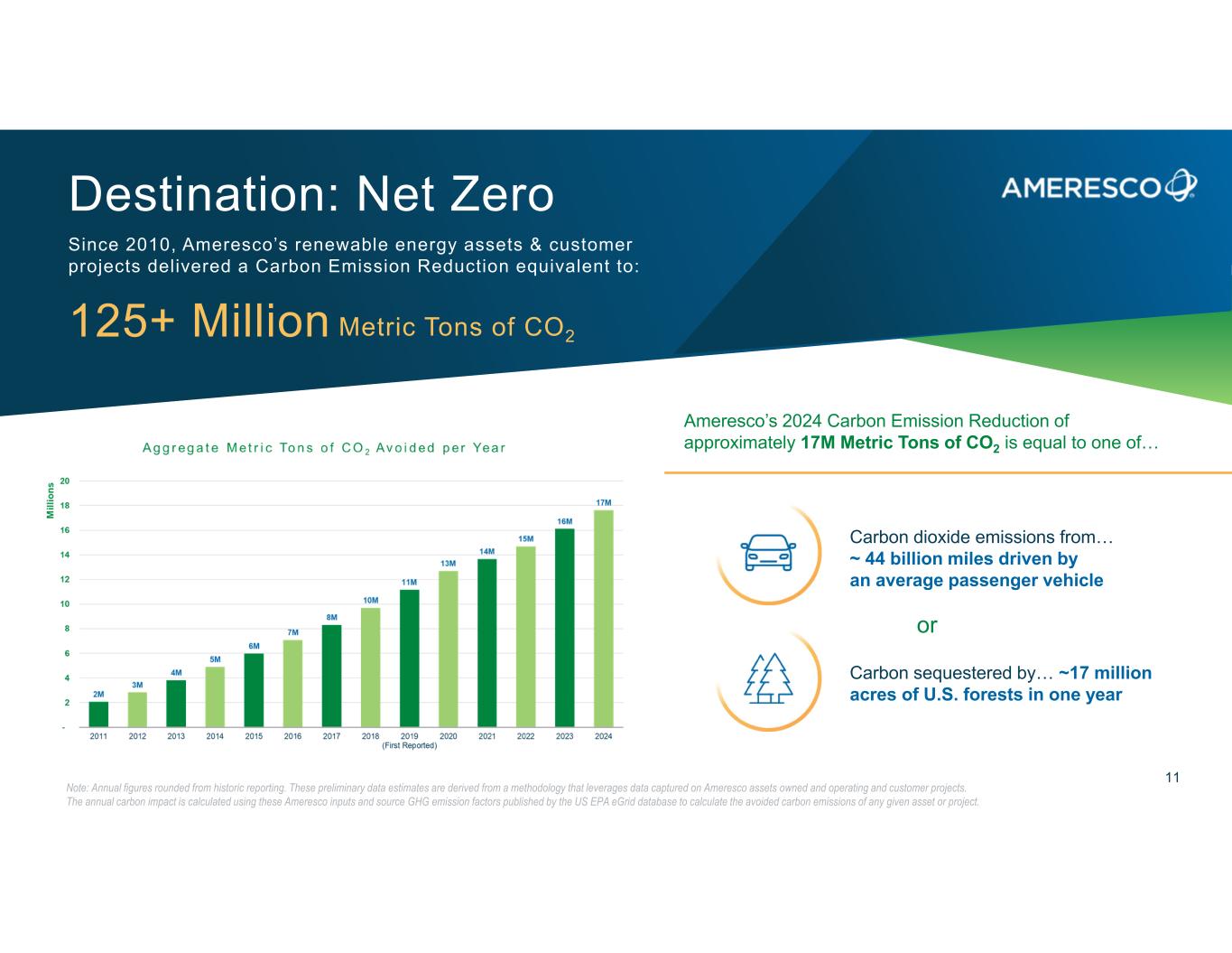 目的地:净零自2010年以来,阿梅雷斯克的可再生能源资产和客户项目交付的碳减排量相当于:125 +百万吨CO2 11来自…~440亿英里的平均乘用车行驶的二氧化碳排放量…~1700万英亩的美国森林在一年内封存的碳或阿梅雷斯克的2024年约1700万吨CO2的碳减排量等于…注:年度数字根据历史报告四舍五入。这些初步数据估计是基于一种利用对拥有和运营的阿梅雷斯克资产以及客户项目捕获的数据的方法得出的。每年的碳影响是使用美国EPA eGrid数据库公布的这些阿梅雷斯克输入和来源GHG排放因子来计算的,用于计算任何给定资产或项目避免的碳排放。11