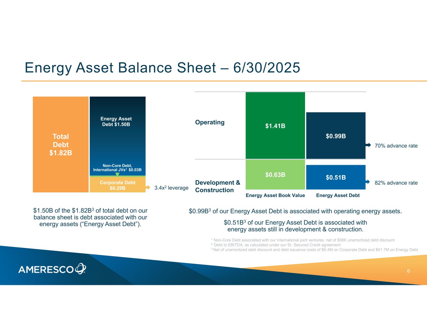 能源资产资产负债表– 6/30/202561与我们的国际合资企业相关的非核心债务,扣除5.8万美元的未摊销债务折扣2债务与EBITDA,根据我们的高级担保信贷协议3计算,扣除公司债务的未摊销债务折扣和债务发行成本640万美元和能源债务的4170万美元,我们的能源资产债务中0.99B3美元与运营能源资产相关。我们的能源资产债务中的0.51B3美元与仍在开发和建设中的能源资产相关。在我们资产负债表上1.82B3美元的总债务中,1.50B美元是与我们的能源资产相关的债务(“能源资产债务”)。总债务$ 1.82B公司债务$ 0.29B非核心债务,国际合资公司1 $ 0.03B ▼能源资产债务$ 1.50B 3.4x2杠杆$ 0.63B $ 0.51B $ 1.41B $ 0.99B能源资产账面价值能源资产债务70%预支率运营开发和建设82%预支率