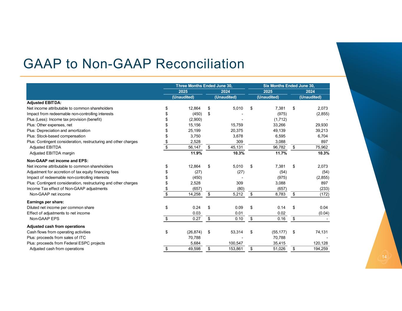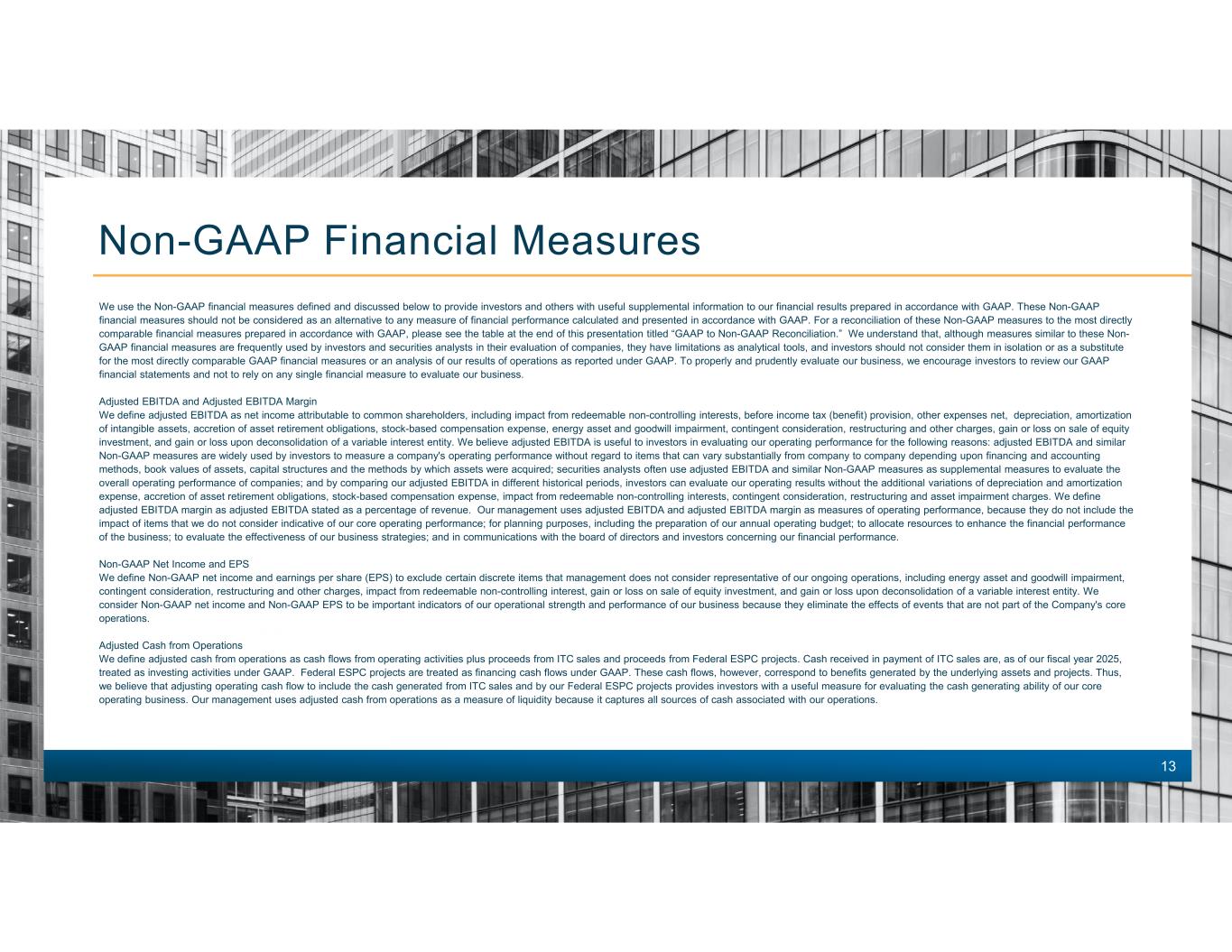 13非GAAP财务指标我们使用下文定义和讨论的非GAAP财务指标,为投资者和其他人提供根据GAAP编制的财务业绩的有用补充信息。这些非GAAP财务指标不应被视为替代任何根据GAAP计算和列报的财务业绩指标。有关这些非GAAP指标与根据GAAP编制的最直接可比的财务指标的对账,请参阅本演示文稿末尾标题为“GAAP与非GAAP对账”的表格。我们了解到,尽管投资者和证券分析师在评估公司时经常使用类似于这些非GAAP财务指标的衡量标准,但它们作为分析工具存在局限性,投资者不应孤立地考虑它们或将其作为最直接可比的GAAP财务指标或我们在GAAP下报告的经营业绩分析的替代品。为了适当和审慎地评估我们的业务,我们鼓励投资者审查我们的GAAP财务报表,而不是依赖任何单一的财务指标来评估我们的业务。调整后EBITDA和调整后EBITDA利润率我们将调整后EBITDA定义为归属于普通股股东的净收入,包括来自可赎回非控股权益的影响,扣除所得税(福利)拨备、其他费用净额、折旧、无形资产摊销、资产报废义务的增加、基于股票的补偿费用、能源资产和商誉减值、或有对价、重组和其他费用、出售股权投资的收益或损失,以及可变利益实体分拆时的收益或损失。我们认为,调整后的EBITDA有助于投资者评估我们的经营业绩,原因如下:调整后的EBITDA和类似的Non-GAAP衡量标准被投资者广泛用于衡量公司的经营业绩,而不考虑因融资和会计方法、资产账面价值、资本结构和收购资产的方法而可能因公司而有很大差异的项目;证券分析师经常使用调整后的EBITDA和类似的Non-GAAP衡量标准作为评估公司整体经营业绩的补充衡量标准;并通过比较我们在不同历史时期的调整后EBITDA,投资者可以在没有折旧和摊销费用、资产报废义务增加、基于股票的补偿费用、可赎回非控股权益的影响、或有对价、重组和资产减值费用的情况下评估我们的经营业绩。我们将调整后EBITDA利润率定义为调整后EBITDA表示为收入的百分比。我们的管理层使用调整后EBITDA和调整后EBITDA利润率作为经营业绩的衡量标准,因为它们不包括我们认为不代表我们核心经营业绩的项目的影响;用于规划目的,包括编制我们的年度经营预算;分配资源以提高业务的财务业绩;评估我们的业务战略的有效性;以及与董事会和投资者就我们的财务业绩进行沟通。Non-GAAP净收入和EPS我们定义Non-GAAP净收入和每股收益(EPS)是为了排除管理层认为不代表我们持续运营的某些离散项目,包括能源资产和商誉减值、或有对价、重组和其他费用、可赎回非控股权益的影响、出售股权投资的收益或损失以及可变利益实体分拆后的收益或损失。我们认为非美国通用会计准则净利润和非美国通用会计准则每股收益是衡量我们运营实力和业务表现的重要指标,因为它们消除了不属于公司核心业务的事件的影响。调整后的经营现金我们将调整后的经营现金定义为经营活动产生的现金流量加上ITC销售收益和联邦ESPC项目收益。截至我们的2025财年,支付ITC销售所收到的现金在GAAP下被视为投资活动。联邦ESPC项目在GAAP下被视为融资现金流。然而,这些现金流对应的是基础资产和项目产生的收益。因此,我们认为,调整经营现金流以包括ITC销售和我们的联邦ESPC项目产生的现金,为投资者评估我们核心经营业务的现金产生能力提供了一个有用的衡量标准。我们的管理层使用调整后的运营现金作为流动性的衡量标准,因为它涵盖了与我们的运营相关的所有现金来源。