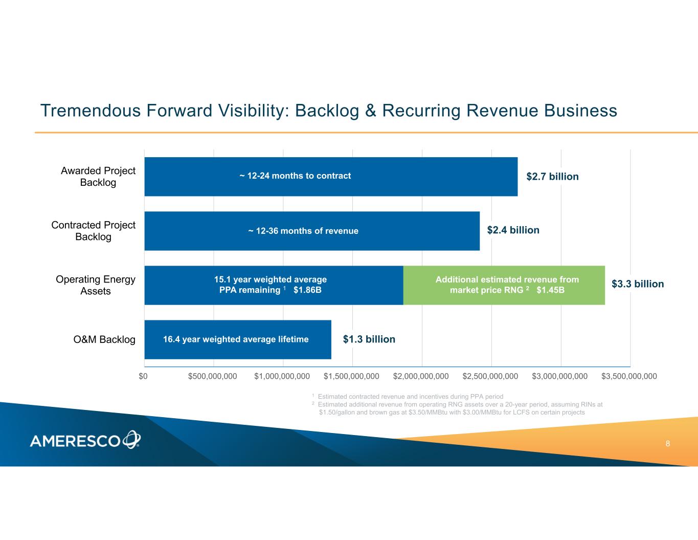 0美元500,000,000美元1,000,000,000美元1,500,000,000美元2,000,000,000美元2,500,000,000美元3,000,000,000美元3,500,000,000美元3,500,000,000美元已授予项目积压合同项目积压运营能源资产O & M积压巨大的前瞻性可见性:积压和经常性收入业务824亿美元33亿美元~12-24个月至合同~12-36个月收入16.4年加权平均寿命27亿美元13亿美元15.1年加权平均购电协议剩余1 $ 1.86B来自市场价格的额外估计收入RNG 2 $ 1.45B 1来自购电协议期间的估计合同收入和奖励2来自20年期间运营的AAA资产的估计额外收入,假设RIN为1.50美元/加仑,棕色天然气为3.50美元/百万英热单位,某些项目的LCFS为3.00美元/百万英热单位