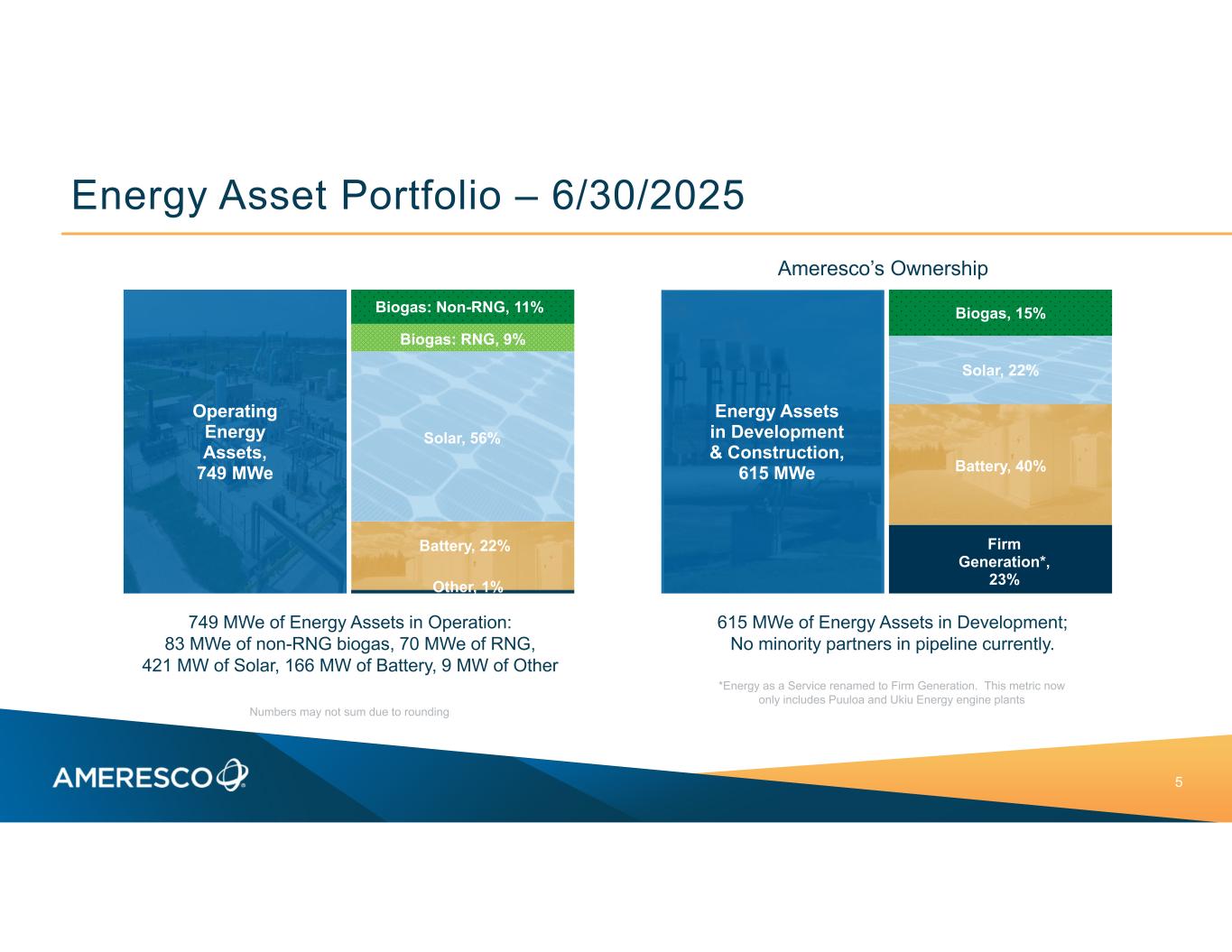能源资产组合– 6/30/20255749 MWe运营中的能源资产:83 MWe的非RNG沼气、70 MWe的RNG、421兆瓦的太阳能、166兆瓦的电池、9兆瓦的其他615 MWe的发展中能源资产;目前没有少数合伙人在管道中。经营性能源资产,749MWE其他,1%电池,22%太阳能,56%沼气:RNG,9%沼气:非RNG,11%开发建设能源资产,615MWE实盘发电*、23%电池、40%太阳能、22%沼气、15%数字因四舍五入可能不相加*能源即服务更名为企业发电。这一指标现在仅包括Puuloa和Ukiu Energy发动机工厂阿梅雷斯克的所有权