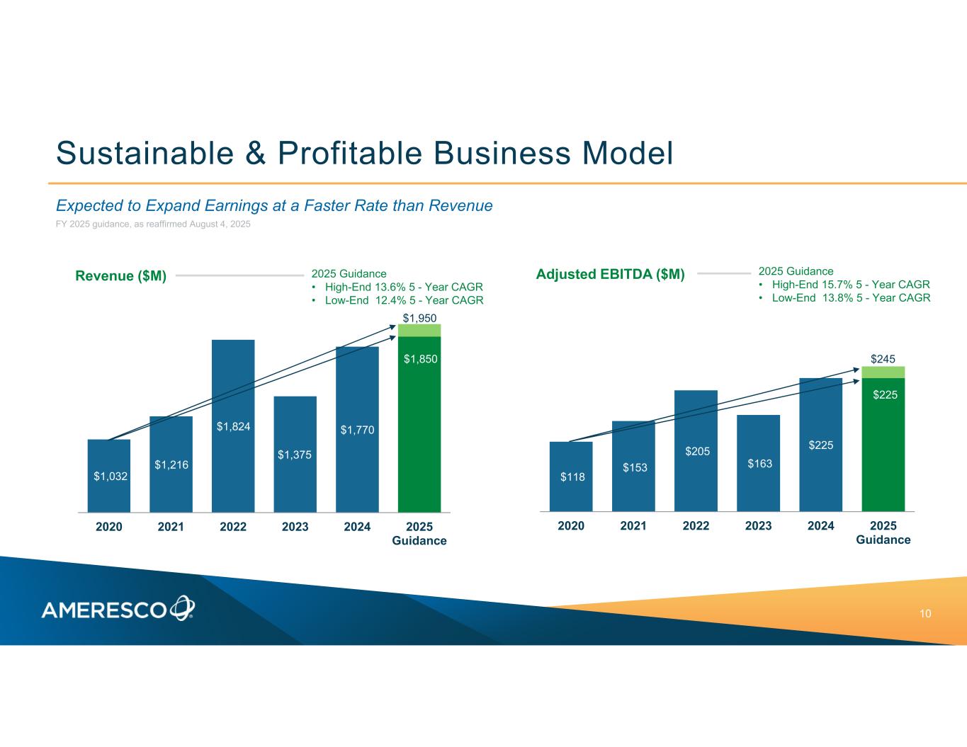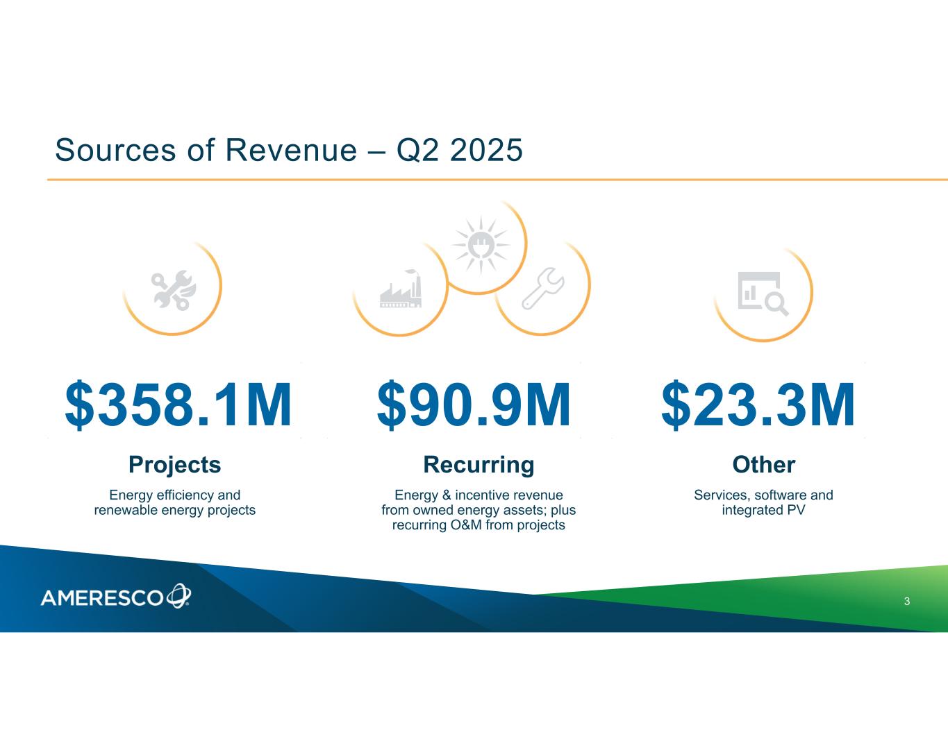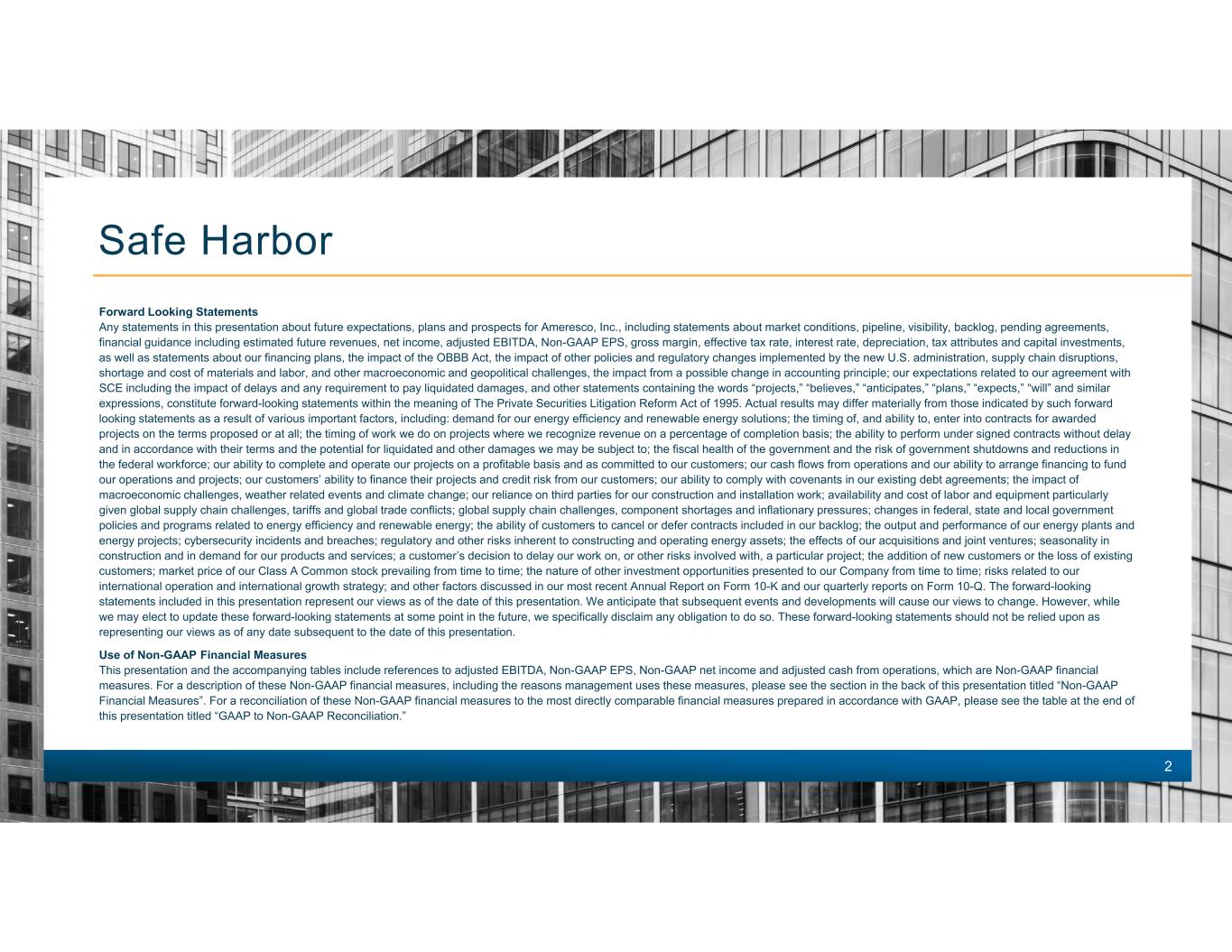 2安全港前瞻性陈述本演示文稿中有关Ameresco, Inc.未来预期、计划和前景的任何陈述,包括有关市场状况、管道、可见度、积压、未决协议、财务指导包括估计未来收入、净收入、调整后EBITDA、非公认会计准则每股收益、毛利率、有效税率、利率、折旧、税收属性和资本投资的陈述,以及关于我们的融资计划、OBBB法案的影响、美国新政府实施的其他政策和监管变化的影响、供应链中断、材料和劳动力短缺和成本,以及其他宏观经济和地缘政治挑战的陈述,会计原则可能发生变化的影响;我们与SCE协议相关的预期,包括延迟的影响和支付违约金的任何要求,以及包含“项目”、“相信”、“预期”、“计划”、“预期”、“将”和类似表述的其他陈述,构成1995年《私人证券诉讼改革法案》含义内的前瞻性陈述。由于各种重要因素,实际结果可能与此类前瞻性陈述所表明的结果存在重大差异,这些因素包括:对我们的能效和可再生能源解决方案的需求;时机和能力,按照提议的条款或根本没有就已授予的项目订立合同;我们在按完工百分比确认收入的项目上所做工作的时间安排;根据已签署的合同毫不拖延地并按照其条款履行的能力以及我们可能受到的违约金和其他损害赔偿的可能性;政府的财政健康状况以及政府关闭和联邦劳动力减少的风险;我们在盈利基础上完成和运营我们的项目的能力并作为对客户的承诺;我们的运营现金流以及我们安排融资为我们的运营和项目提供资金的能力;我们的客户为其项目融资的能力以及来自客户的信用风险;我们遵守现有债务协议中的契约的能力;宏观经济挑战、天气相关事件和气候变化的影响;我们的建筑和安装工作依赖第三方;劳动力和设备的可用性和成本,特别是考虑到全球供应链挑战、关税和全球贸易冲突;全球供应链挑战、零部件短缺和通胀压力;联邦的变化,州和地方政府有关能源效率和可再生能源的政策和计划;客户取消或推迟我们积压的合同的能力;我们的能源工厂和能源项目的产量和绩效;网络安全事件和违规行为;建设和运营能源资产所固有的监管和其他风险;我们的收购和合资企业的影响;建设和对我们的产品和服务的需求的季节性;客户决定推迟我们的工作,或涉及的其他风险,特定项目;新客户的增加或现有客户的流失;我们不时出现的A类普通股市场价格;不时向我们公司提出的其他投资机会的性质;与我们的国际业务和国际增长战略相关的风险;以及我们最近的10-K表格年度报告和10-Q表格季度报告中讨论的其他因素。本演示文稿中包含的前瞻性陈述代表我们截至本演示文稿发布之日的观点。我们预计,随后发生的事件和事态发展将导致我们的观点发生变化。然而,尽管我们可能会选择在未来某个时候更新这些前瞻性陈述,但我们明确表示不承担这样做的任何义务。这些前瞻性陈述不应被视为代表我们在本演示文稿日期之后的任何日期的观点。非GAAP财务指标的使用本演示文稿和随附的表格包括对调整后EBITDA、非GAAP每股收益、非GAAP净收入和调整后运营现金的引用,这些都是非GAAP财务指标。有关这些非GAAP财务指标的描述,包括管理层使用这些指标的原因,请参阅本演示文稿后面标题为“非GAAP财务指标”的部分。有关这些非GAAP财务指标与根据GAAP编制的最直接可比财务指标的对账,请参阅本演示文稿末尾标题为“GAAP与非GAAP对账”的表格。