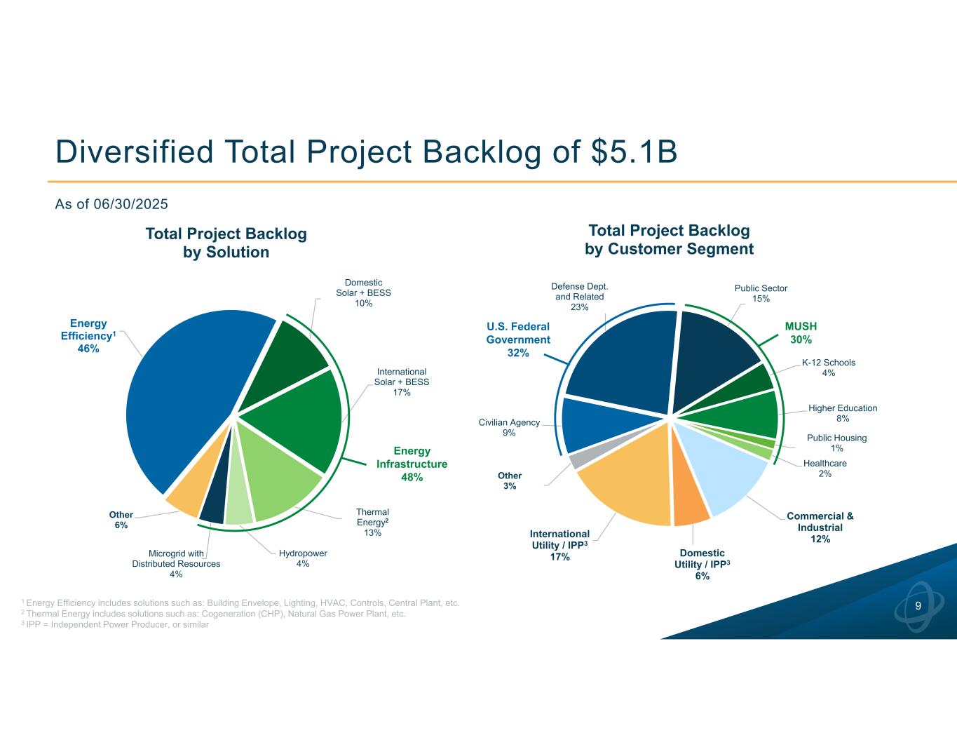 多元化的项目总积压$ 5.1B 9截至2025年6月30日1能效包括解决方案如:建筑围护结构、照明、暖通空调、控制、中央工厂等2热能包括解决方案如:热电联产(CHP)、天然气发电厂等3 IPP =独立发电商,或类似能效1 46%国内太阳能+ BESS 10%国际太阳能+ BESS 17%热能2 13%水电4%分布式资源微电网4%其他6%解决方案能源基础设施项目积压总量48%民事局9%国防部及相关23%公共部门15% K-12学校4%高等教育8%公共住房1%医疗保健2%商业和工业12%国内公用事业/IPP3 6%国际公用事业/IPP3 17%其他3%按客户细分项目积压总量美国联邦政府32% MUSH 30%