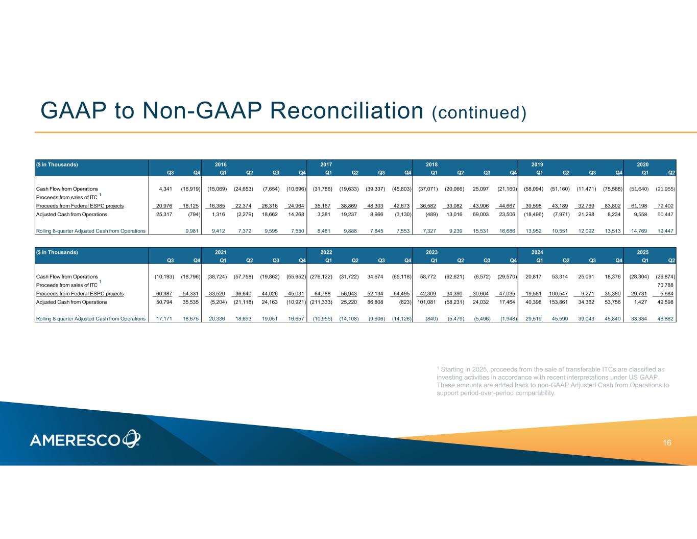 GAAP与Non-GAAP对账(续)15*按业务线划分的调整后EBITDA包括按收入份额分配的公司费用$ 000美元项目运营资产O & M其他合并调整后EBITDA:归属于普通股股东的净利润5,326美元(2,458)3,380美元1,133美元7,381美元可赎回非控股权益的影响-$(975)$-$-$(975)$加(减):所得税准备金(利益)1,262美元(3,225)$ 138美元113美元(1,712)$加:其他费用,净额8,967美元22,853美元607美元839美元33,266美元加:折旧和摊销1,941美元46,345美元539美元314美元49,139美元加:股票薪酬4,872美元956美元422美元345美元6,595美元加:重组和其他费用2,663美元397美元23美元5美元3,088美元调整后EBITDA 25,031美元63,893美元5,109美元2,749美元96,782美元调整后EBITDA利润率4.1% 53.4% 9.7% 6.4% 11.7%截至2025年6月30日的六个月