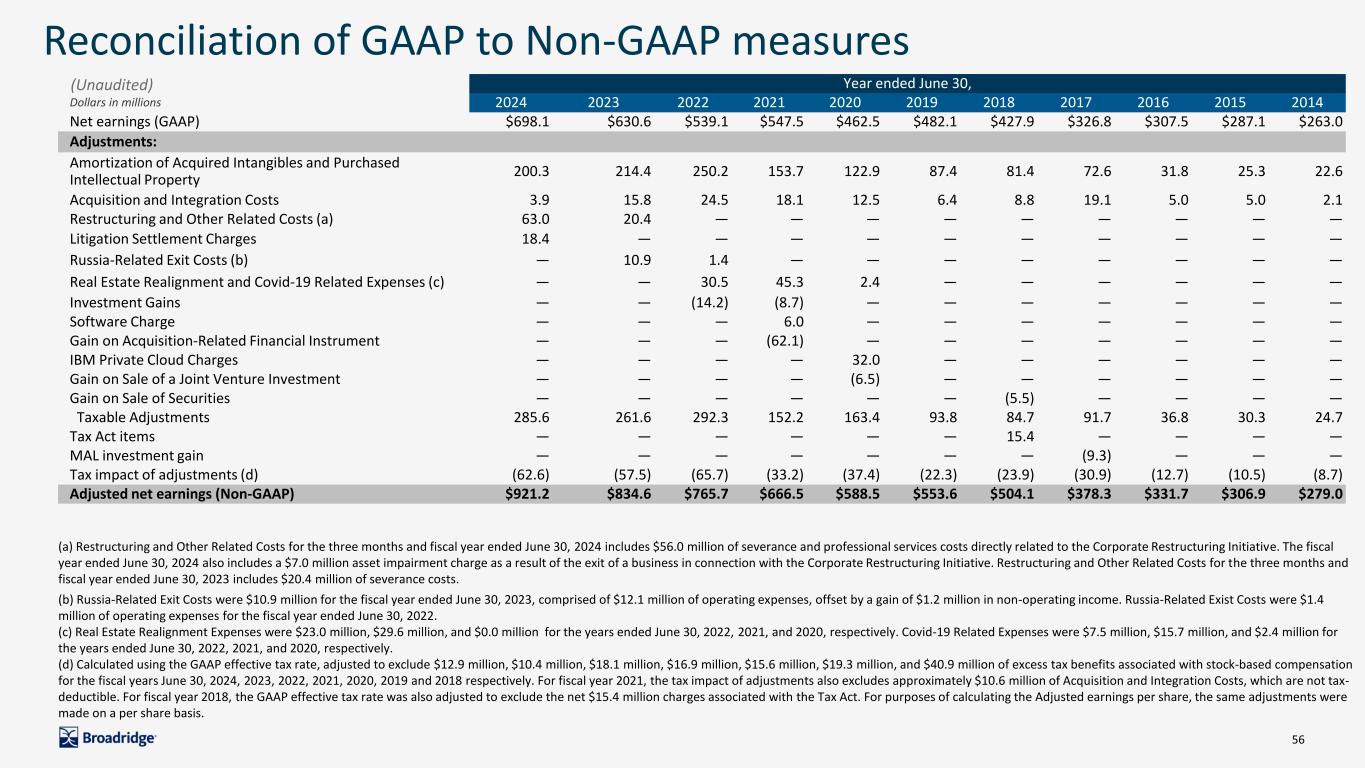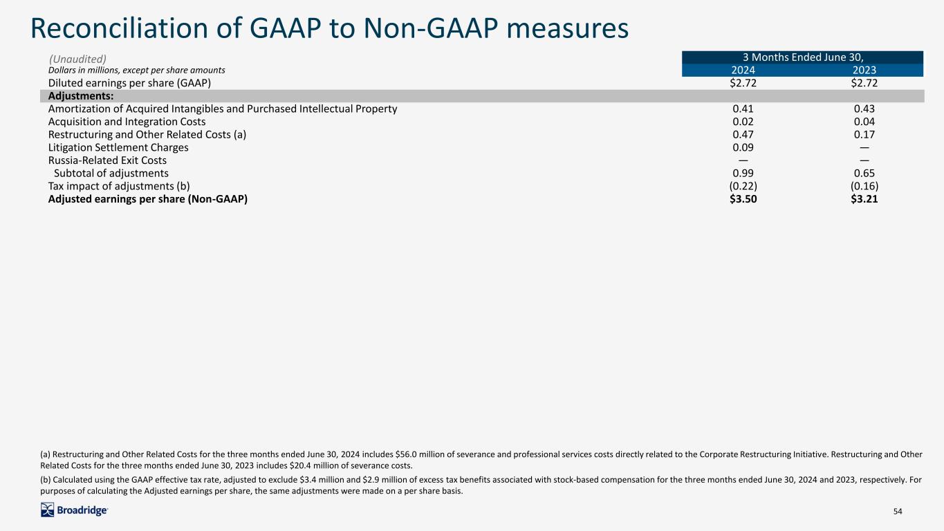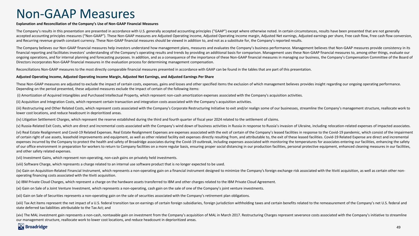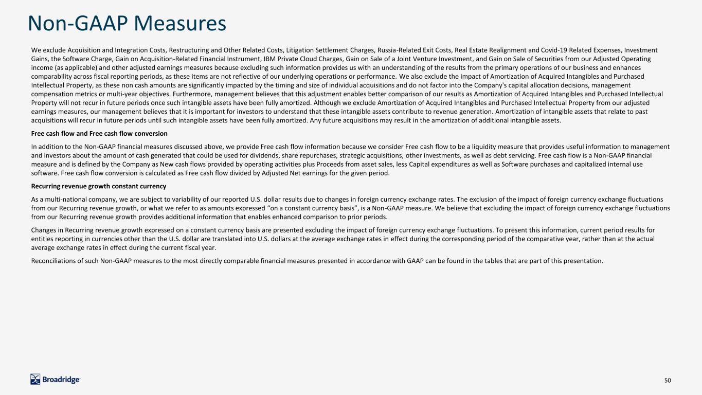 49非公认会计原则措施公司使用非公认会计原则财务措施的解释和调节本演示文稿中公司的业绩按照美国公认会计原则(“GAAP”)列报,除非另有说明。在某些情况下,提出的结果不是普遍接受的会计原则衡量标准(“非公认会计原则”)。这些非GAAP衡量标准是调整后的营业收入、调整后的营业利润率、调整后的净利润、调整后的每股收益、自由现金流、自由现金流转换以及经常性收入增长固定货币。这些非公认会计准则财务指标应被视为公司报告业绩的补充,而不是替代。公司认为,我们的非公认会计准则财务指标有助于投资者了解管理层如何规划、衡量和评估公司的业务表现。管理层认为,非公认会计准则计量提供了财务报告的一致性,并通过提供额外的比较基础,促进投资者了解公司的经营业绩和趋势。管理层使用这些非公认会计准则财务指标,除其他外,评估我们的持续运营,并用于内部规划和预测目的。此外,由于这些非GAAP财务指标在管理我们的业务方面的重要性,公司董事会薪酬委员会在确定管理层薪酬的评估过程中纳入了非GAAP财务指标。非GAAP计量与根据GAAP列报的最直接可比财务计量的调节可在本列报的表格中找到。调整后的营业收入、调整后的营业利润率、调整后的净收益和调整后的每股收益这些非公认会计准则衡量标准进行了调整,以排除某些成本、费用、损益和其他特定项目的影响,管理层认为,排除这些项目可以对我们的持续经营业绩提供洞察力。根据所列期间的不同,这些调整后的计量不包括以下某些项目的影响:(i)所购无形资产和所购知识产权的摊销,这是与公司收购活动相关的非现金摊销费用。(ii)收购和整合成本,代表与公司收购活动相关的某些交易和整合成本。(iii)重组和其他相关成本,指与公司的公司重组举措相关的成本,以退出和/或重新调整我们的一些业务、精简公司的管理结构、将工作重新分配到成本较低的地点以及减少优先领域的员工人数。(iv)诉讼和解费用,这是在2024财年第三和第四季度建立的与理赔相关的准备金。(v)与俄罗斯相关的退出成本,这是与公司因应俄罗斯入侵乌克兰而停止在俄罗斯的业务活动相关的直接和增量成本,包括受影响的联营公司的搬迁相关费用。(vi)房地产调整和新冠相关费用。房地产调整费用是与公司为应对新冠大流行而退出某些租赁设施相关的费用,其中包括某些使用权资产、租赁物改良和设备的减值,以及这些租赁设施退出直接导致并可归因于这些租赁设施退出的其他相关设施退出费用。新冠疫情相关费用是公司在新冠疫情爆发期间为保护Broadridge员工的健康和安全而产生的直接和增量费用,包括与监测员工进入我们设施的温度、加强我们办公环境的安全性以准备工人更定期返回公司设施、确保我们生产设施中适当的社交距离、个人防护设备、加强我们设施中的清洁措施以及其他安全相关费用相关的费用。(vii)投资收益,指私人持有投资的非经营性、非现金收益。(viii)软件费用,指与预期不再使用的内部使用软件产品有关的费用。(ix)与收购相关的金融工具收益,指旨在最大限度降低公司与收购Itiviti相关的外汇风险的金融工具的非经营性收益,以及与收购Itiviti相关的某些其他非经营性融资成本。(x)IBM私有云收费, 这代表了对转让给IBM的硬件资产的收费以及与IBM私有云协议相关的其他收费。(xi)出售合营企业投资的收益,指出售公司其中一项合营企业投资的非经营性现金收益。(xii)出售证券收益指出售与公司退休计划义务相关的证券的非经营性收益。(xiii)税法项目代表美国联邦过渡税对某些外国子公司的收益、外国司法管辖区预扣税以及与重新计量公司归属于税法的美国联邦和州递延税项负债净额相关的某些利益的净影响;(xiv)MAL投资收益代表公司于2017年3月收购MAL的非现金、非应税投资收益。重组费用代表与公司主动精简管理结构、将工作重新分配到成本较低的地点以及减少优先领域的员工人数相关的遣散费。