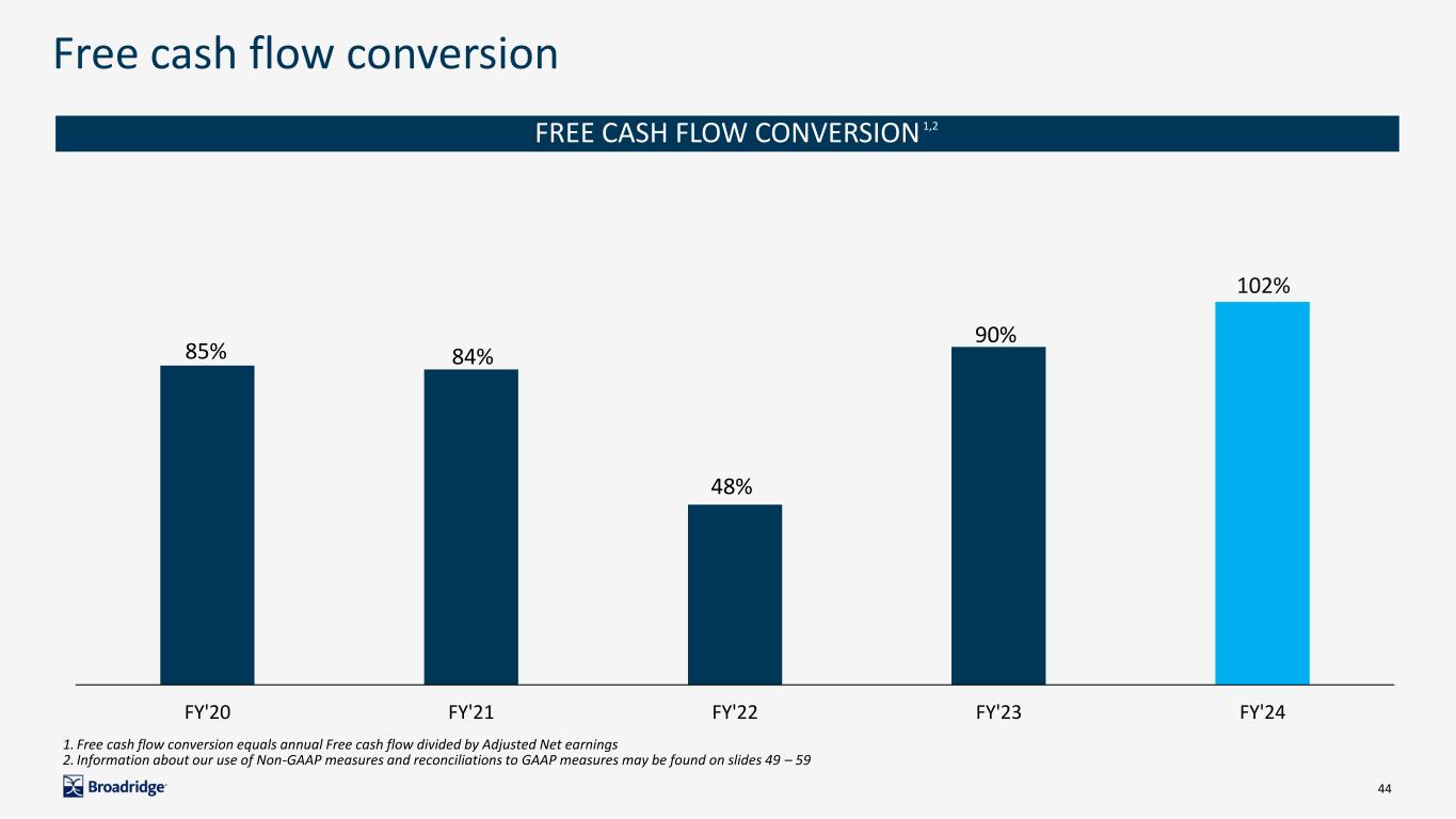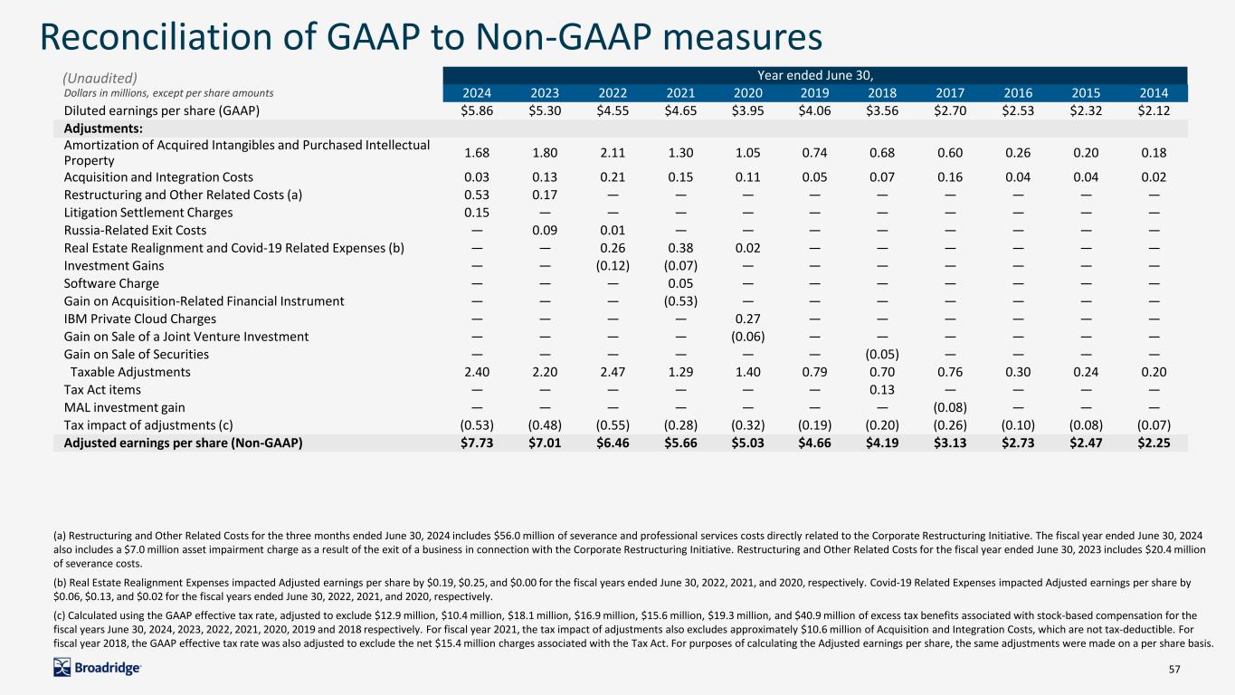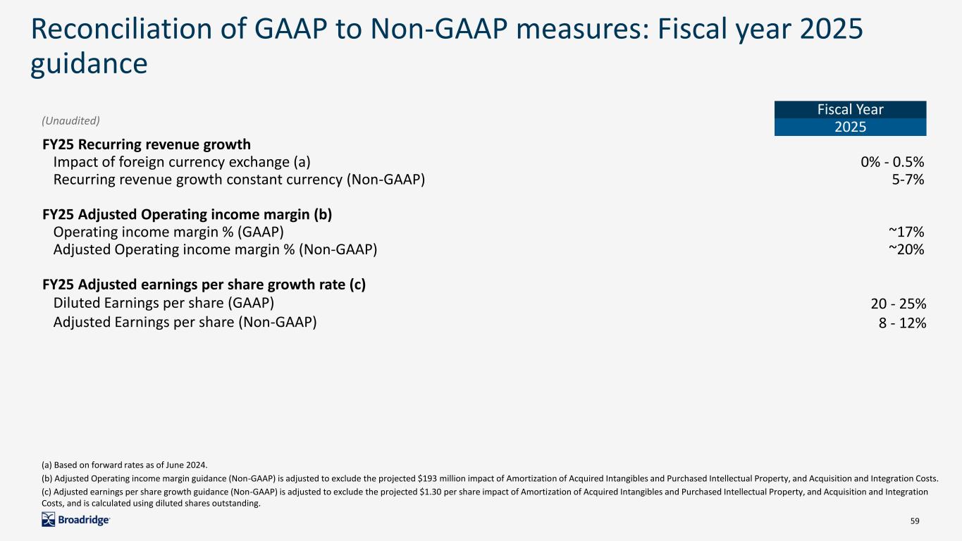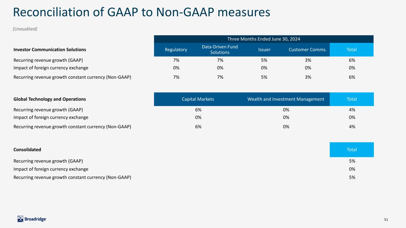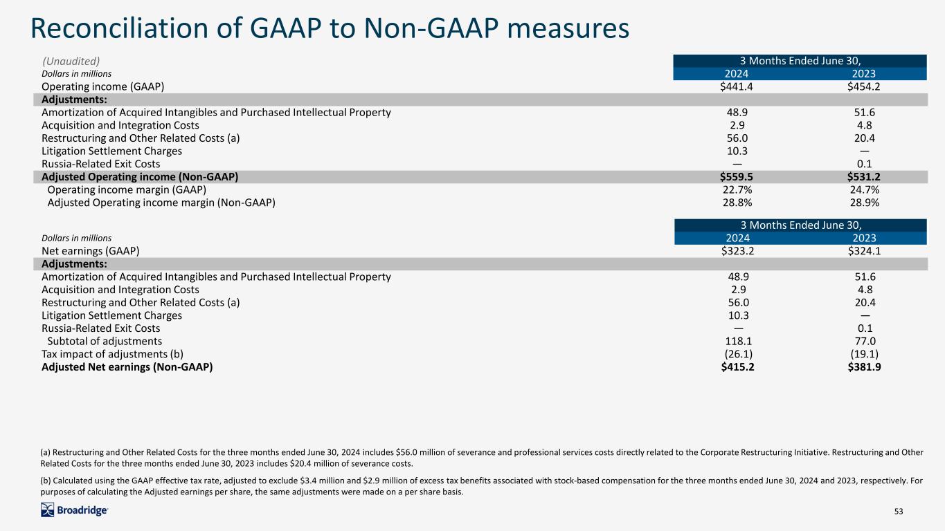 49非公认会计原则措施公司使用非公认会计原则财务措施的解释和调节本演示文稿中公司的业绩按照美国公认会计原则(“GAAP”)列报,除非另有说明。在某些情况下,提出的结果不是普遍接受的会计原则衡量标准(“非公认会计原则”)。这些非GAAP衡量标准是调整后的营业收入、调整后的营业利润率、调整后的净利润、调整后的每股收益、自由现金流、自由现金流转换以及经常性收入增长固定货币。这些非公认会计准则财务指标应被视为公司报告业绩的补充,而不是替代。公司认为,我们的非公认会计准则财务指标有助于投资者了解管理层如何规划、衡量和评估公司的业务表现。管理层认为,非公认会计准则计量提供了财务报告的一致性,并通过提供额外的比较基础,促进投资者了解公司的经营业绩和趋势。管理层使用这些非公认会计准则财务指标,除其他外,评估我们的持续运营,并用于内部规划和预测目的。此外,由于这些非GAAP财务指标在管理我们的业务方面的重要性,公司董事会薪酬委员会在确定管理层薪酬的评估过程中纳入了非GAAP财务指标。非GAAP计量与根据GAAP列报的最直接可比财务计量的调节可在本列报的表格中找到。调整后的营业收入、调整后的营业利润率、调整后的净收益和调整后的每股收益这些非公认会计准则衡量标准进行了调整,以排除某些成本、费用、损益和其他特定项目的影响,管理层认为,排除这些项目可以对我们的持续经营业绩提供洞察力。根据所列期间的不同,这些调整后的计量不包括以下某些项目的影响:(i)所购无形资产和所购知识产权的摊销,这是与公司收购活动相关的非现金摊销费用。(ii)收购和整合成本,代表与公司收购活动相关的某些交易和整合成本。(iii)重组和其他相关成本,指与公司的公司重组举措相关的成本,以退出和/或重新调整我们的一些业务、精简公司的管理结构、将工作重新分配到成本较低的地点以及减少优先领域的员工人数。(iv)诉讼和解费用,这是在2024财年第三和第四季度建立的与理赔相关的准备金。(v)与俄罗斯相关的退出成本,这是与公司因应俄罗斯入侵乌克兰而停止在俄罗斯的业务活动相关的直接和增量成本,包括受影响的联营公司的搬迁相关费用。(vi)房地产调整和新冠相关费用。房地产调整费用是与公司为应对新冠大流行而退出某些租赁设施相关的费用,其中包括某些使用权资产、租赁物改良和设备的减值,以及这些租赁设施退出直接导致并可归因于这些租赁设施退出的其他相关设施退出费用。新冠疫情相关费用是公司在新冠疫情爆发期间为保护Broadridge员工的健康和安全而产生的直接和增量费用,包括与监测员工进入我们设施的温度、加强我们办公环境的安全性以准备工人更定期返回公司设施、确保我们生产设施中适当的社交距离、个人防护设备、加强我们设施中的清洁措施以及其他安全相关费用相关的费用。(vii)投资收益,指私人持有投资的非经营性、非现金收益。(viii)软件费用,指与预期不再使用的内部使用软件产品有关的费用。(ix)与收购相关的金融工具收益,指旨在最大限度降低公司与收购Itiviti相关的外汇风险的金融工具的非经营性收益,以及与收购Itiviti相关的某些其他非经营性融资成本。(x)IBM私有云收费, 这代表了对转让给IBM的硬件资产的收费以及与IBM私有云协议相关的其他收费。(xi)出售合营企业投资的收益,指出售公司其中一项合营企业投资的非经营性现金收益。(xii)出售证券收益指出售与公司退休计划义务相关的证券的非经营性收益。(xiii)税法项目代表美国联邦过渡税对某些外国子公司的收益、外国司法管辖区预扣税以及与重新计量公司归属于税法的美国联邦和州递延税项负债净额相关的某些利益的净影响;(xiv)MAL投资收益代表公司于2017年3月收购MAL的非现金、非应税投资收益。重组费用代表与公司主动精简管理结构、将工作重新分配到成本较低的地点以及减少优先领域的员工人数相关的遣散费。