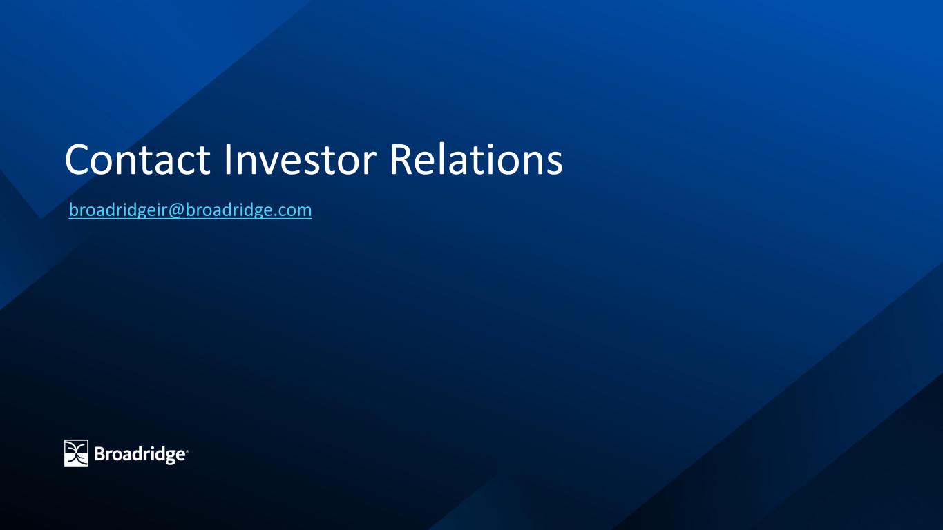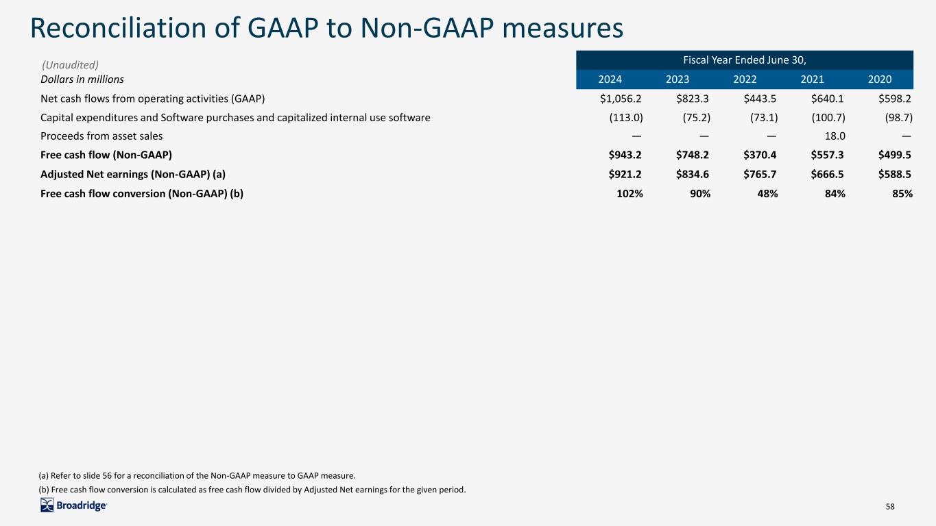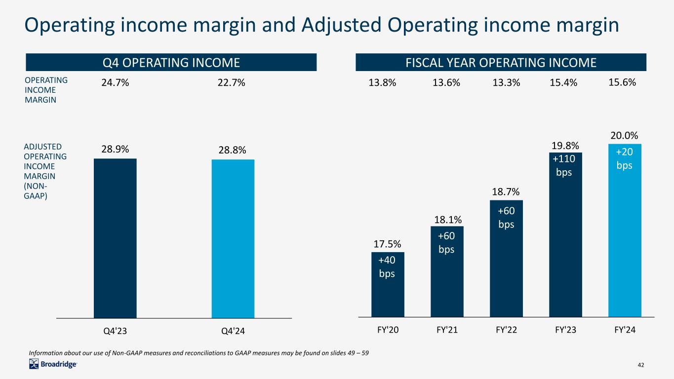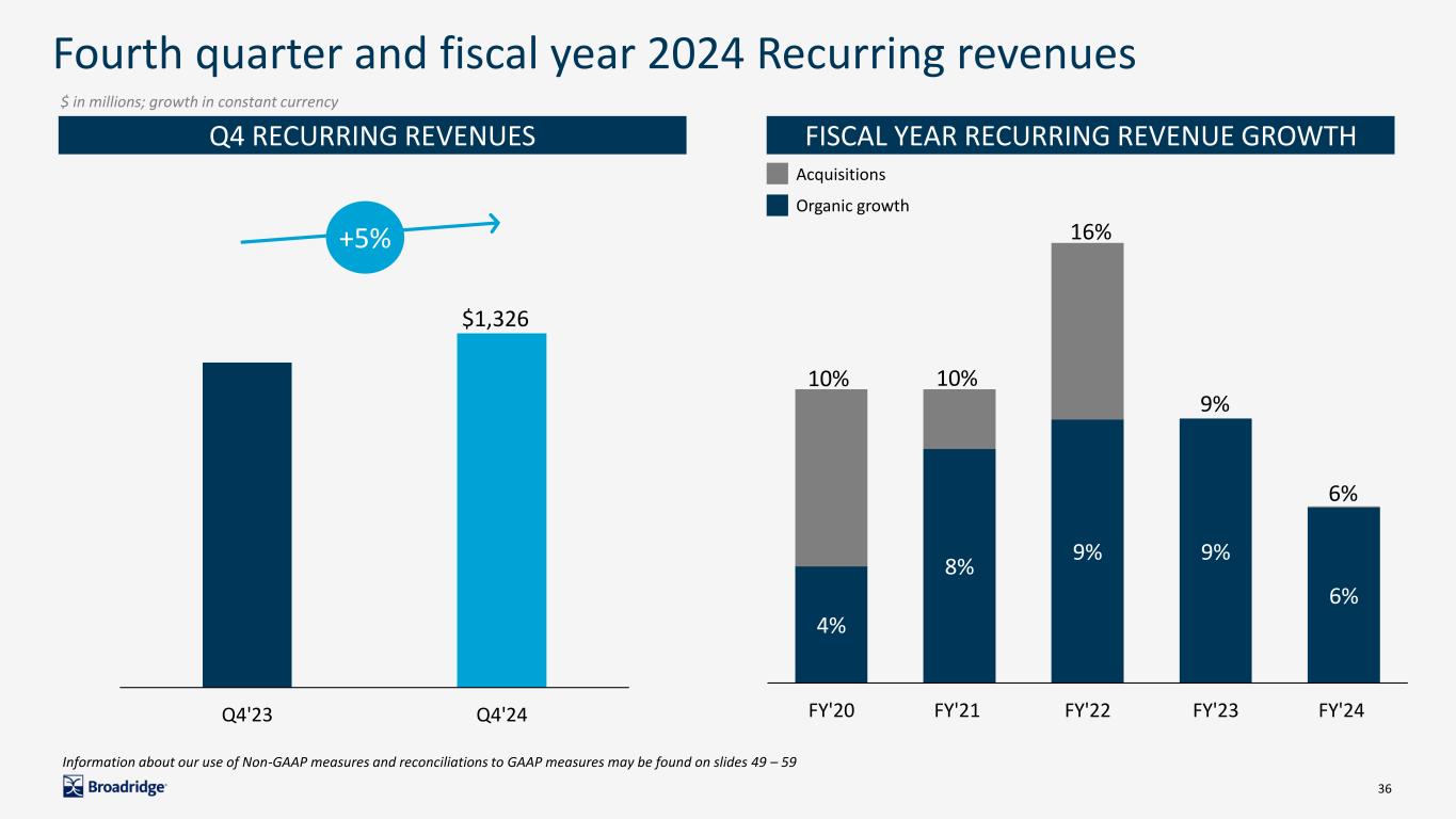 49非公认会计原则措施公司使用非公认会计原则财务措施的解释和调节本演示文稿中公司的业绩按照美国公认会计原则(“GAAP”)列报,除非另有说明。在某些情况下,提出的结果不是普遍接受的会计原则衡量标准(“非公认会计原则”)。这些非GAAP衡量标准是调整后的营业收入、调整后的营业利润率、调整后的净利润、调整后的每股收益、自由现金流、自由现金流转换以及经常性收入增长固定货币。这些非公认会计准则财务指标应被视为公司报告业绩的补充,而不是替代。公司认为,我们的非公认会计准则财务指标有助于投资者了解管理层如何规划、衡量和评估公司的业务表现。管理层认为,非公认会计准则计量提供了财务报告的一致性,并通过提供额外的比较基础,促进投资者了解公司的经营业绩和趋势。管理层使用这些非公认会计准则财务指标,除其他外,评估我们的持续运营,并用于内部规划和预测目的。此外,由于这些非GAAP财务指标在管理我们的业务方面的重要性,公司董事会薪酬委员会在确定管理层薪酬的评估过程中纳入了非GAAP财务指标。非GAAP计量与根据GAAP列报的最直接可比财务计量的调节可在本列报的表格中找到。调整后的营业收入、调整后的营业利润率、调整后的净收益和调整后的每股收益这些非公认会计准则衡量标准进行了调整,以排除某些成本、费用、损益和其他特定项目的影响,管理层认为,排除这些项目可以对我们的持续经营业绩提供洞察力。根据所列期间的不同,这些调整后的计量不包括以下某些项目的影响:(i)所购无形资产和所购知识产权的摊销,这是与公司收购活动相关的非现金摊销费用。(ii)收购和整合成本,代表与公司收购活动相关的某些交易和整合成本。(iii)重组和其他相关成本,指与公司的公司重组举措相关的成本,以退出和/或重新调整我们的一些业务、精简公司的管理结构、将工作重新分配到成本较低的地点以及减少优先领域的员工人数。(iv)诉讼和解费用,这是在2024财年第三和第四季度建立的与理赔相关的准备金。(v)与俄罗斯相关的退出成本,这是与公司因应俄罗斯入侵乌克兰而停止在俄罗斯的业务活动相关的直接和增量成本,包括受影响的联营公司的搬迁相关费用。(vi)房地产调整和新冠相关费用。房地产调整费用是与公司为应对新冠大流行而退出某些租赁设施相关的费用,其中包括某些使用权资产、租赁物改良和设备的减值,以及这些租赁设施退出直接导致并可归因于这些租赁设施退出的其他相关设施退出费用。新冠疫情相关费用是公司在新冠疫情爆发期间为保护Broadridge员工的健康和安全而产生的直接和增量费用,包括与监测员工进入我们设施的温度、加强我们办公环境的安全性以准备工人更定期返回公司设施、确保我们生产设施中适当的社交距离、个人防护设备、加强我们设施中的清洁措施以及其他安全相关费用相关的费用。(vii)投资收益,指私人持有投资的非经营性、非现金收益。(viii)软件费用,指与预期不再使用的内部使用软件产品有关的费用。(ix)与收购相关的金融工具收益,指旨在最大限度降低公司与收购Itiviti相关的外汇风险的金融工具的非经营性收益,以及与收购Itiviti相关的某些其他非经营性融资成本。(x)IBM私有云收费, 这代表了对转让给IBM的硬件资产的收费以及与IBM私有云协议相关的其他收费。(xi)出售合营企业投资的收益,指出售公司其中一项合营企业投资的非经营性现金收益。(xii)出售证券收益指出售与公司退休计划义务相关的证券的非经营性收益。(xiii)税法项目代表美国联邦过渡税对某些外国子公司的收益、外国司法管辖区预扣税以及与重新计量公司归属于税法的美国联邦和州递延税项负债净额相关的某些利益的净影响;(xiv)MAL投资收益代表公司于2017年3月收购MAL的非现金、非应税投资收益。重组费用代表与公司主动精简管理结构、将工作重新分配到成本较低的地点以及减少优先领域的员工人数相关的遣散费。