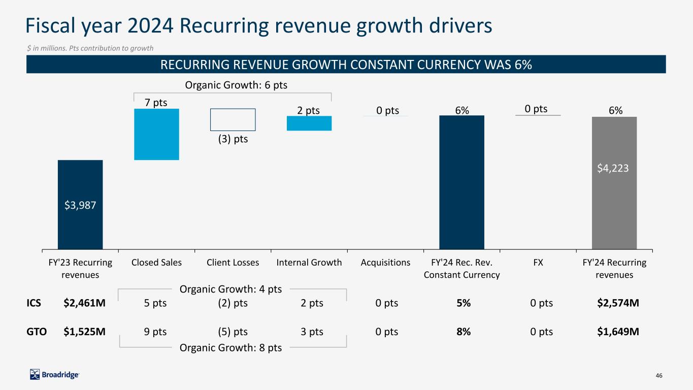 46 $ 3,987 FY‘23经常性收入关闭销售客户损失内部增长收购FY’24 rec。Rev. Constant Currency FX'24财年经常性收入经常性收入增长恒定货币为6% 2024财年经常性收入增长驱动因素ICS 24.61亿美元5 pts(2)pts 2 pts 0 pts 5% 0 pts 25.74亿美元GTO 15.25亿美元9 pts(5)pts 3 pts 0 pts 8% 0 pts 16.49亿美元7 pts(3)pts 2 pts 0 pts 6% 0 pts6 %有机增长:4 pts 4,223美元百万。PTS贡献增长有机增长:8pts有机增长:6pts