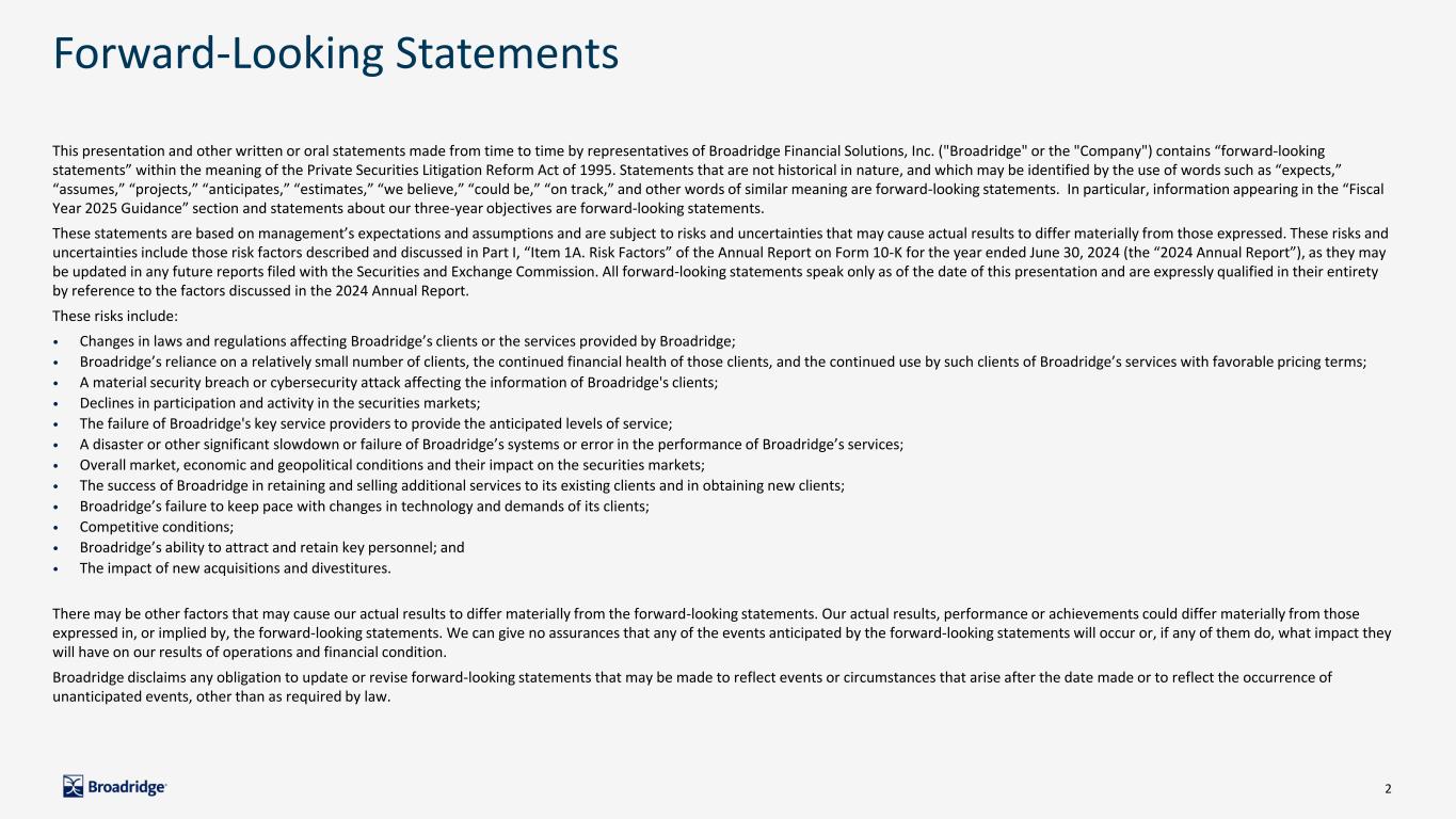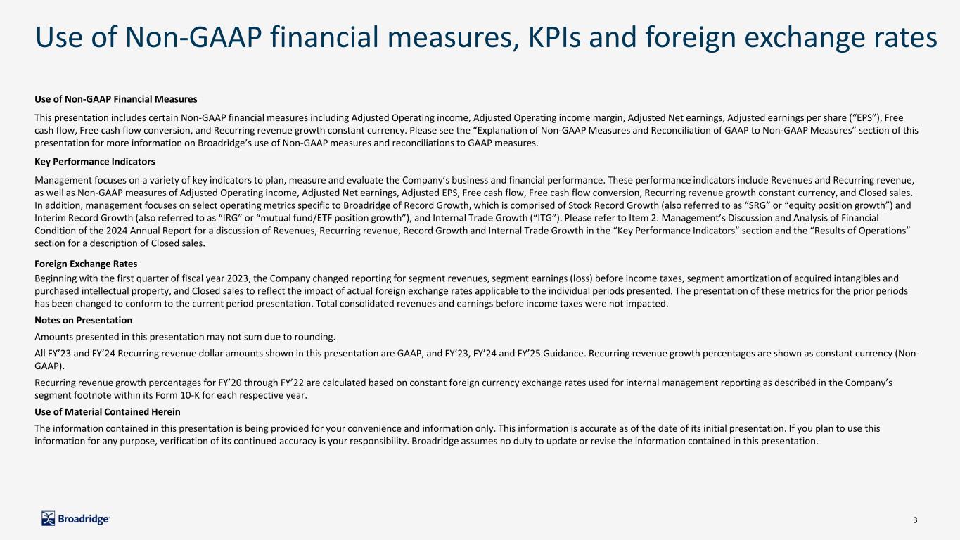 2前瞻性陈述本演示文稿以及Broadridge Financial Solutions, Inc.(“Broadridge”或“公司”)代表不时作出的其他书面或口头陈述包含1995年《私人证券诉讼改革法案》含义内的“前瞻性陈述”。非历史性质的陈述,可通过使用“预期”、“假设”、“项目”、“预期”、“估计”、“我们认为”、“可能”、“在轨道上”等词语来识别,以及其他类似含义的词语,均为前瞻性陈述。特别是,出现在“2025财年指导”部分的信息以及关于我们三年目标的陈述都是前瞻性陈述。这些陈述基于管理层的预期和假设,并受到可能导致实际结果与所表达的结果存在重大差异的风险和不确定性的影响。这些风险和不确定性包括第一部分“第1A项”中描述和讨论的风险因素。截至2024年6月30日止年度的10-K表格年度报告(“2024年年度报告”)的风险因素”,因为它们可能会在未来提交给美国证券交易委员会的任何报告中更新。所有前瞻性陈述仅在本演示文稿发布之日发表,并通过参考2024年年度报告中讨论的因素明确对其全部内容进行限定。这些风险包括:•影响Broadridge客户或Broadridge提供的服务的法律法规的变化;• Broadridge对相对少数客户的依赖,这些客户的持续财务健康,以及这些客户继续使用具有优惠定价条款的Broadridge服务;•影响Broadridge客户信息的重大安全漏洞或网络安全攻击;•证券市场的参与度和活动下降;• Broadridge的主要服务提供商未能提供预期水平的服务;• Broadridge的系统发生灾难或其他重大放缓或故障,或Broadridge服务的性能出现错误;•整体市场,经济和地缘政治状况及其对证券市场的影响;• Broadridge在保留和向现有客户出售额外服务以及获得新客户方面的成功;• Broadridge未能跟上技术变化和客户需求的步伐;•竞争条件;• Broadridge吸引和留住关键人员的能力;•新的收购和资产剥离的影响。可能还有其他因素可能导致我们的实际结果与前瞻性陈述存在重大差异。我们的实际结果、业绩或成就可能与前瞻性陈述中表达或暗示的内容存在重大差异。我们不能保证前瞻性陈述预期的任何事件将会发生,或者,如果其中任何一个发生,它们将对我们的经营业绩和财务状况产生何种影响。除法律要求外,Broadridge不承担任何更新或修改前瞻性陈述以反映作出日期之后发生的事件或情况或反映意外事件发生的义务。