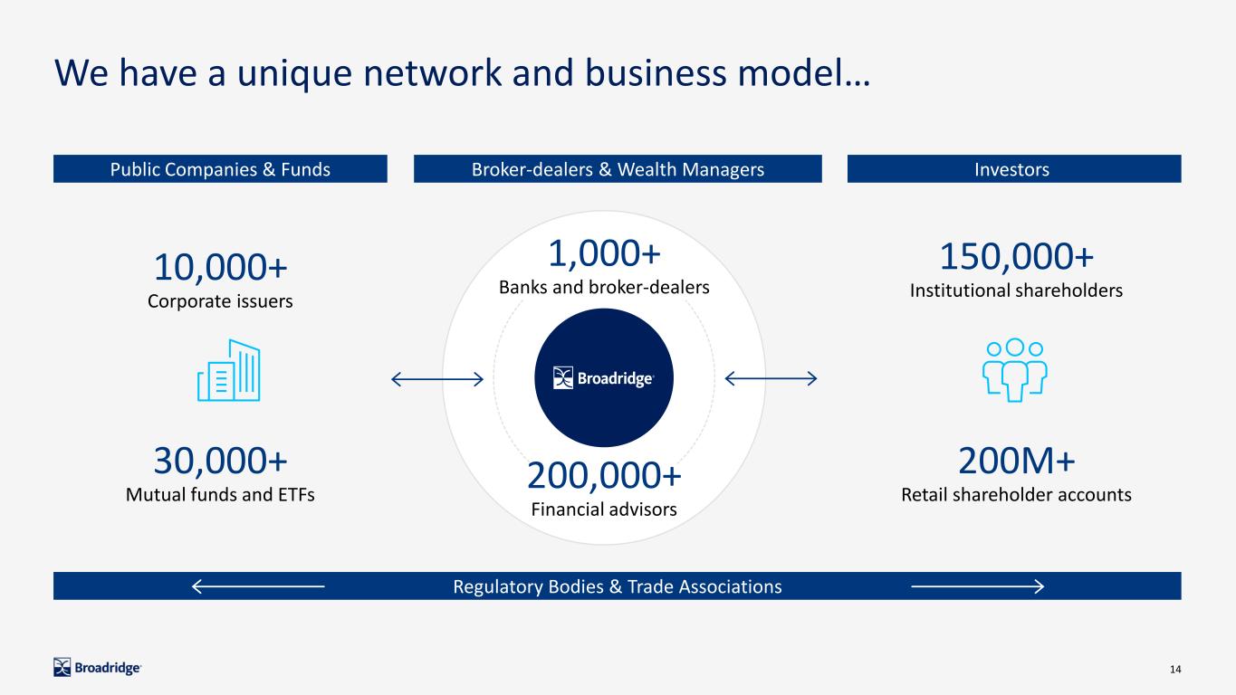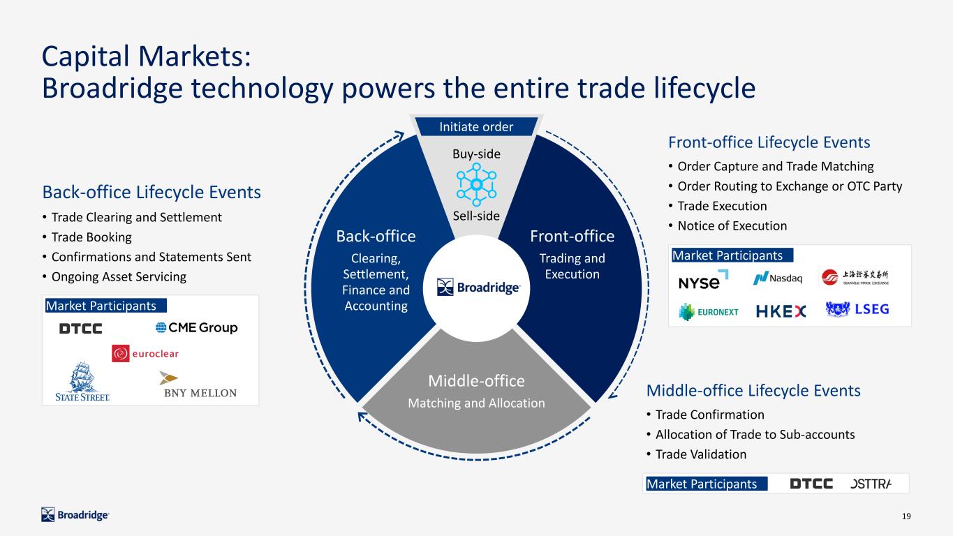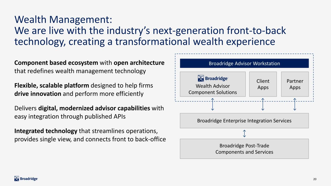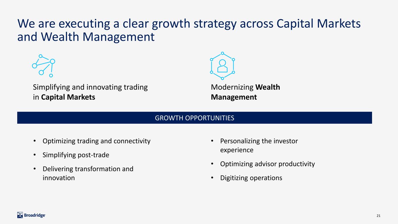 18 FY‘20 FY’21 FY‘22 FY’23 FY'24 Broadridge是一家领先的资本市场和财富管理技术提供商,经常性收入平均为1.6BGTO美元。年增长13% 10% Capital Markets Wealth & Inv.MGMT。15%注:按固定汇率计算的增长。有关我们使用非公认会计原则措施以及与公认会计原则措施对账的信息,请参见幻灯片49 – 59 $ 0.6B $ 1.0B
