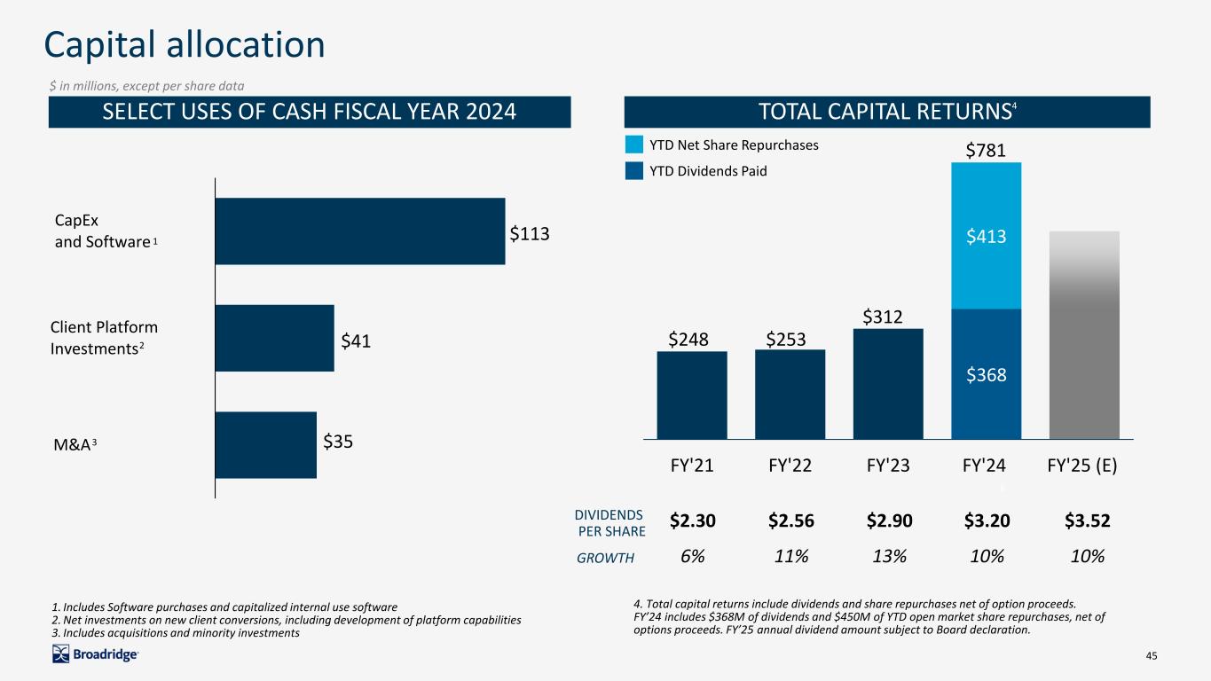 45 $ 368 $ 413 FY‘21 FY’22 FY‘23 FY’24 FY'25(e)并购客户平台投资资本支出和软件选择使用现金2024财年总资本回报率资本分配以百万美元计,每股数据除外$ 2.30 $ 2.56 $ 2.90 $ 3.20 $ 3.526% 11% 13% 10% 10%每股股息21。包括软件购买和资本化的内部使用软件2。对新客户转换的净投资,包括平台能力的开发3。包括收购和少数股权投资1美元41美元113美元35364美元。总资本回报包括股息和股票回购扣除期权收益。24财年包括3.68亿美元的股息和年初至今4.5亿美元的公开市场股票回购,扣除期权收益。FY’25年度股息金额以董事会宣布为准。增长253美元248美元312美元4美元781年初至今净股票回购年初至今已支付股息