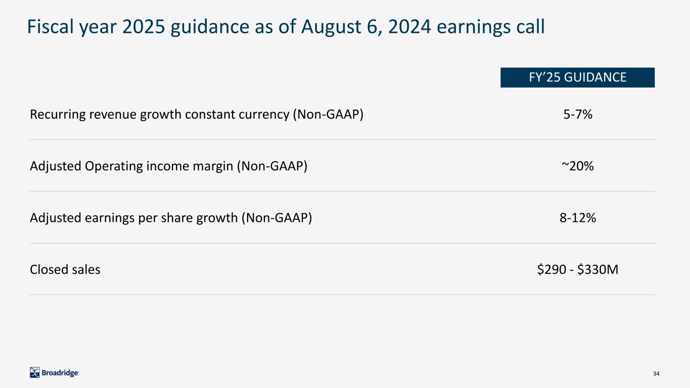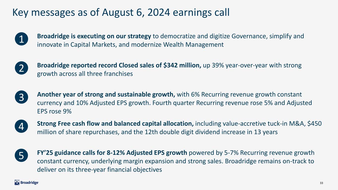 截至2024年8月6日财报电话会议的33个关键信息Broadridge正在执行我们的战略,以实现治理民主化和数字化、资本市场简化和创新以及财富管理现代化Broadridge报告创纪录的封闭式销售额为3.42亿美元,同比增长39%,所有三个特许经营权均实现强劲增长又是强劲和可持续增长的一年,经常性收入增长6%固定货币和10%调整后每股收益增长。第四季度经常性收入增长5%,调整后每股收益增长9%强劲的自由现金流和平衡的资本配置,包括增值并购、4.5亿美元的股票回购,以及13年来第12次两位数的股息增长FY'25指引要求调整后每股收益增长8-12 %,这得益于5-7 %的经常性收入增长固定汇率、基本利润率扩张和强劲的销售。Broadridge仍有望实现其三年财务目标12345