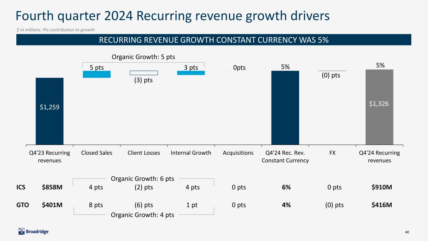 40 $ 1,259 Q4‘23经常性收入关闭销售客户损失内部增长收购Q4’24 rec。Rev. Constant Currency FX Q4 ' 24经常性收入经常性收入增长恒定货币为5% 2024年第四季度经常性收入增长驱动因素ICS 8.58亿美元4 pts(2)pts 4 pts 0 pts 6% 0 pts 9.1亿美元GTO 4.01亿美元8 pts(6)pts 1 pt 0 pts 4%(0)pts 4.16亿美元5 pts(3)pts 3 pts 0pts 5%(0)pts 5%有机增长:6 pts百万美元。PTS对增长的贡献有机增长:4pts有机增长:5pts $ 1,326