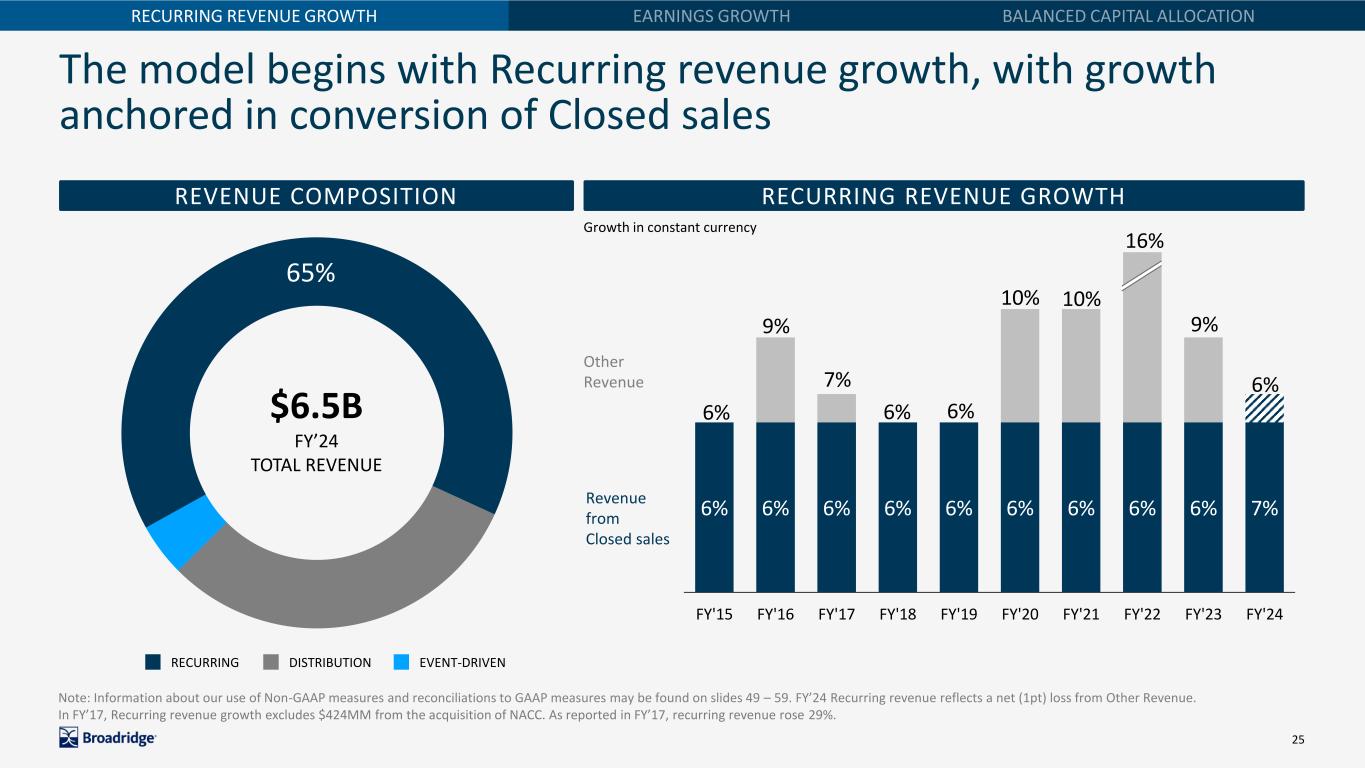 23 Broadridge强大的业务和财务模型定位于推动可持续的长期增长,经常性收入平衡资本配置TSR调整后EPS~100%自由现金流转换和中高青少年7-9 %的可持续增长(5-8 %有机)8-12 %稳定和持续增长复合财务模型的前四分位数TSR制胜公式注:有关我们使用非公认会计原则措施以及与公认会计原则措施对账的信息,请参见幻灯片49 – 59