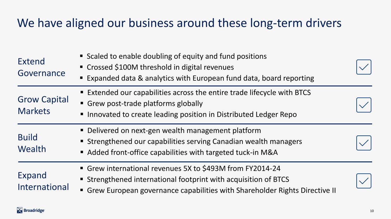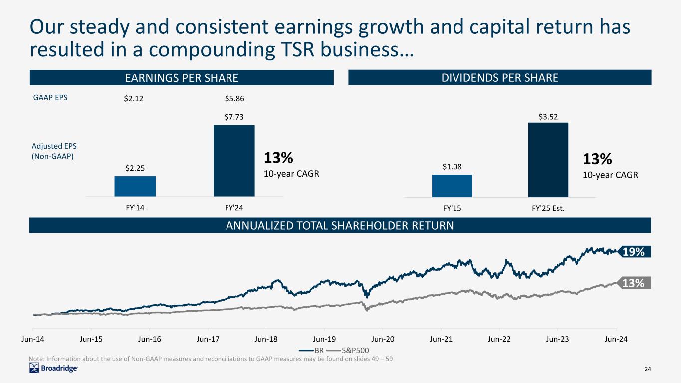 24JUN-14 JUN-15 JUN-16 JUN-17 JUN-18 JUN-19 JUN-20 JUN-21 JUN-22 JUN-23 JUN-24 BR S & P500注:有关使用非公认会计原则措施以及与公认会计原则措施对账的信息可在幻灯片49 – 59中找到我们稳定和持续的盈利增长和资本回报导致复合TSR业务…$ 1.08 $ 3.52 FY‘15 FY’25 EST. $ 2.25 $ 7.73 FY‘14 FY’24 13% 10年复合年收益每股股息年化总股东回报13% 10年复合年增长率19% 13% GAAP EPS $ 2.12 $ 5.86调整后EPS(non-GAAP)