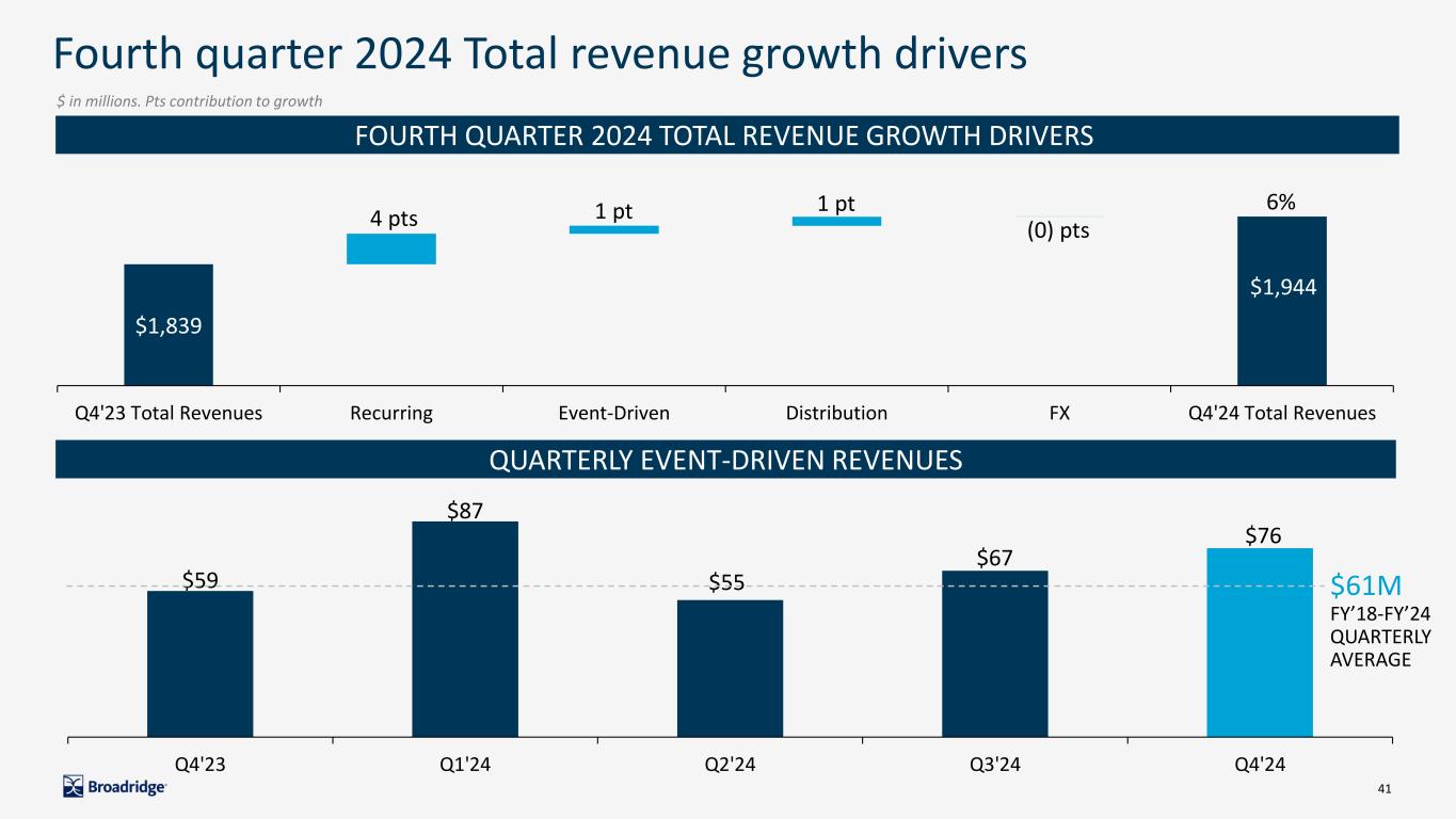 41 2024年第四季度总收入增长驱动因素$ 59 $ 87 $ 55 $ 76 Q4‘23 Q1’24 Q2‘24 Q3’24 Q4‘24 $ 6100万FY’18-FY‘24季度平均2024年第四季度总收入增长驱动因素$ 1,839 Q4’23总收入经常性事件驱动分销外汇Q4 ' 24总收入季度事件驱动收入4 pts 1 pt 1 pt 6%(0)pts 67 $百万美元。PT对增长的贡献1,944美元