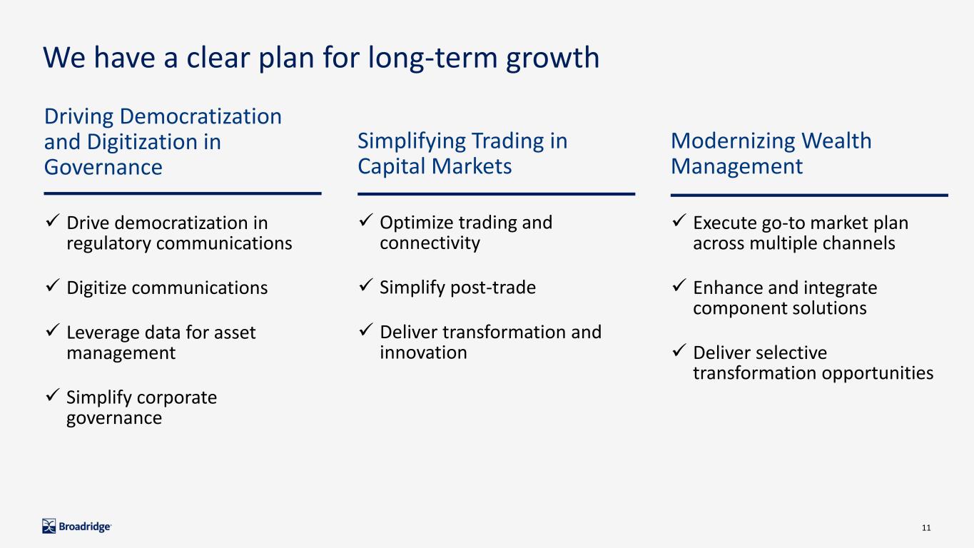 10我们围绕这些长期驱动因素调整了我们的业务,扩展治理▪扩大规模,使股票和基金头寸翻倍▪数字收入突破1亿美元门槛▪利用欧洲基金数据扩展数据和分析,董事会报告▪通过BTCS将我们的能力扩展到整个贸易生命周期▪在全球范围内建立交易后平台▪进行创新以创造分布式账本回购的领先地位▪在下一代财富管理平台上交付▪加强我们为加拿大财富管理公司服务的能力▪通过有针对性的打包并购增加前台能力▪从2014-24财年起,国际收入增长了5倍,达到4.93亿美元▪通过收购TERM0加强国际足迹▪通过股东权利指令II建立欧洲治理能力资本市场建立财富扩展国际