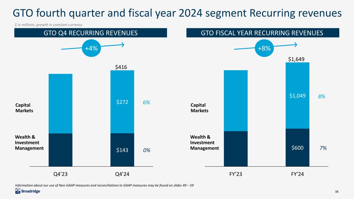 38 $ 600 $ 1,049 FY‘23 FY’24 FY‘24 GTO第四季度和2024财年部门经常性收入GTO Q4经常性收入TERM1财年经常性收入资本市场财富与投资管理1649美元百万;以固定货币计算增长+ 4% + 8%有关我们使用非GAAP措施以及与GAAP措施对账的信息可在幻灯片49 – 598% 7% $ 143 $ 272 Q4’23 Q4'24资本市场财富与投资管理$ 4166% 0%