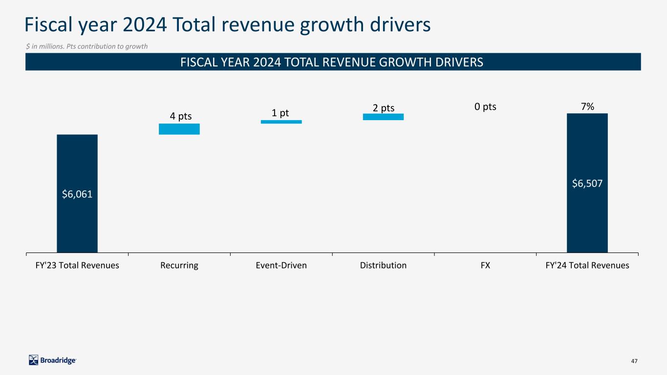 47财政年度2024财政年度总收入增长驱动因素2024财政年度总收入增长驱动因素6,061美元6,507美元23财政年度总收入经常性事件驱动分销外汇24财政年度总收入4分1分2分7% 0分百万美元。PT对增长的贡献