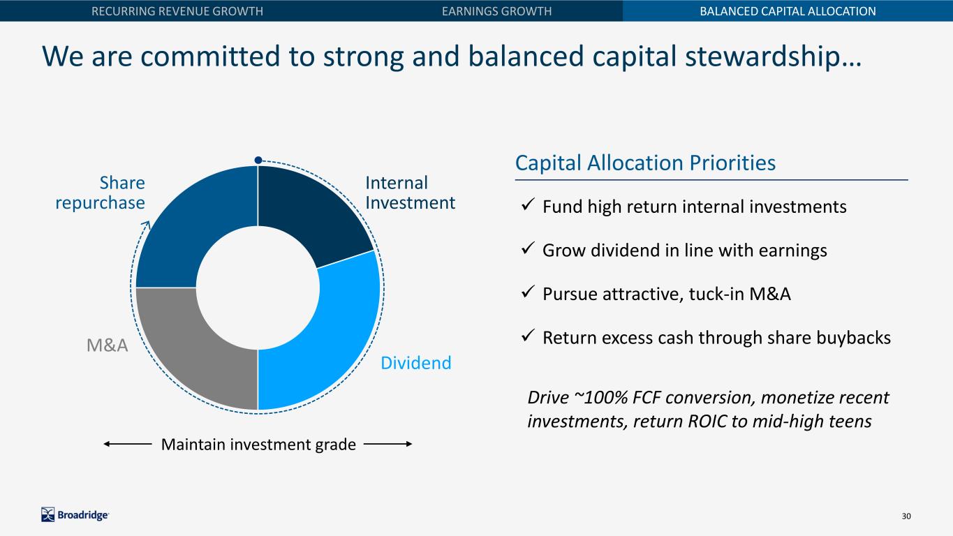 2712010408012040606011020财年15财年16财年17财年18财年19财年20财年21财年22财年23财年24财年20.0% 15财年24财年AOI利润率扩张历史(bps;NON-GAAP)50个基点平均年扩张目标10年平均年AOI利润率扩张70个基点Broadridge长期以来一直能够扩大利润率经常性收入增长盈利增长平衡资本分配注:17财年不包括NACC整合的影响。包括NACC导致利润率降低350个基点。有关我们使用非公认会计原则措施以及与公认会计原则措施对账的信息,请参见幻灯片49 – 5917.4% 17.3% 12.9% 13.8% 15.0% 13.8% 13.6% 13.3% 15.4% 15.6% GAAP利润率