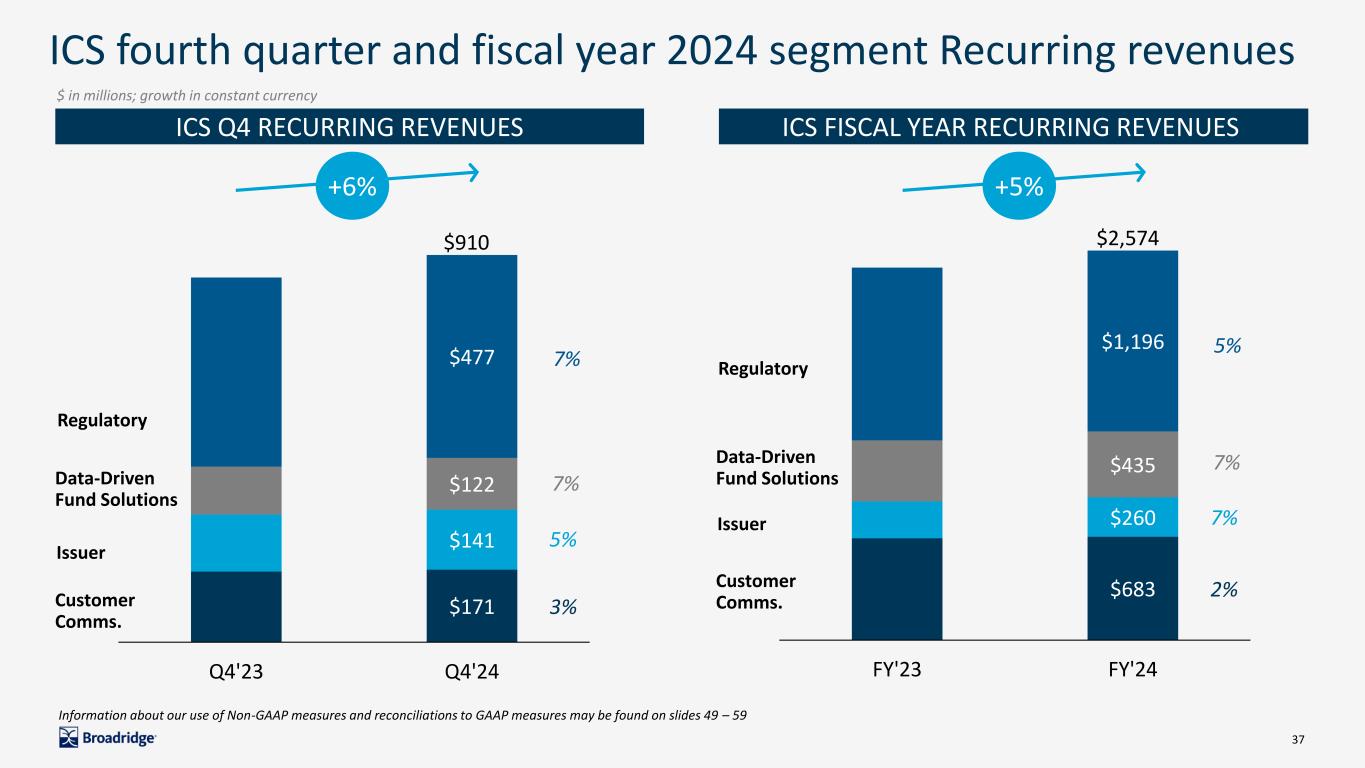 3使用非GAAP财务指标、KPI和汇率使用非GAAP财务指标本演示文稿包括某些非GAAP财务指标,包括调整后的营业收入、调整后的营业利润率、调整后的净利润、调整后的每股收益(“EPS”)、自由现金流、自由现金流转换以及经常性收入增长不变货币。有关Broadridge使用非GAAP措施以及与GAAP措施的对账的更多信息,请参阅本演示文稿的“非GAAP措施的解释以及GAAP与非GAAP措施的对账”部分。关键绩效指标管理层专注于各种关键指标,以规划、衡量和评估公司的业务和财务绩效。这些业绩指标包括收入和经常性收入,以及调整后营业收入、调整后净利润、调整后每股收益、自由现金流、自由现金流转换、经常性收入增长固定货币和已完成销售的非GAAP衡量标准。此外,管理层重点关注Broadridge特定于创纪录增长的精选运营指标,该指标包括股票创纪录增长(也称为“SRG”或“权益头寸增长”)和中期创纪录增长(也称为“IRG”或“共同基金/ETF头寸增长”),以及内部贸易增长(“ITG”)。请参阅第2项。管理层对2024年年度报告财务状况的讨论和分析,在“关键绩效指标”部分讨论收入、经常性收入、创纪录的增长和内部贸易增长,在“运营结果”部分讨论已完成销售。外汇汇率从2023财年第一季度开始,公司更改了分部收入、分部所得税前收益(亏损)、收购的无形资产和购买的知识产权的分部摊销以及已完成的销售的报告,以反映适用于所列各个期间的实际外汇汇率的影响。以往各期这些指标的列报方式已更改,以符合本期的列报方式。合并总收入和所得税前利润不受影响。关于列报的说明由于四舍五入的原因,本列报中列报的金额可能不相加。本演示文稿中显示的所有23财年和24财年经常性收入美元金额均为GAAP,以及23财年、24财年和25财年的指引。经常性收入增长百分比显示为固定货币(Non-GAAP)。20财年至22财年的经常性收入增长百分比是根据公司在各自年度的10-K表格中的分部脚注中所述的内部管理报告所使用的固定外币汇率计算的。此处包含的材料的使用本演示文稿中包含的信息仅为您的方便和信息而提供。截至首次提交之日,这些信息是准确的。如果您打算将这些信息用于任何目的,验证其持续准确性是您的责任。Broadridge不承担更新或修改本演示文稿中包含的信息的义务。