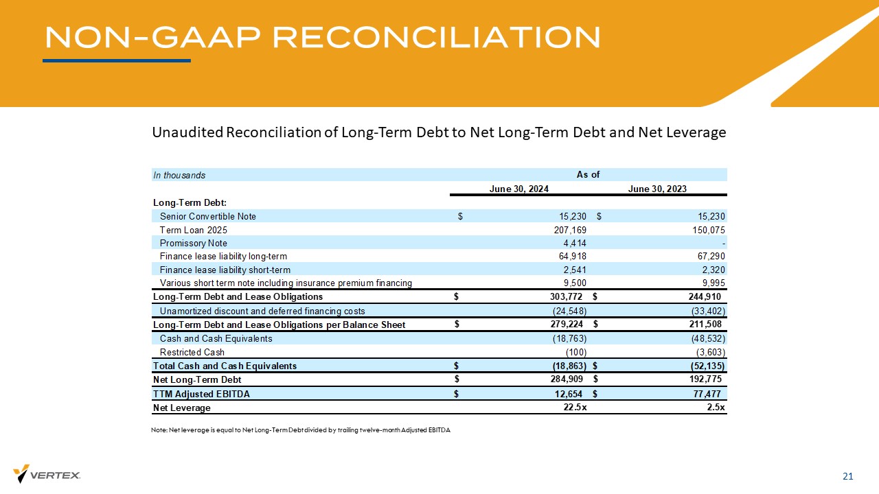 NON-GAAP调节21长期债务与净长期债务和净杠杆的未经审计调节注:净杠杆等于净长期债务除以过去12个月调整后EBITDA,单位:千2024年6月30日6月30日,2023长期债务:优先可转换票据$ 15,230 $ 15,230定期贷款2025207,169150,075本票4,414-融资租赁负债长期64,91867,290融资租赁负债短期2,5412,320各种短期票据,包括保险费融资9,5009,995长期债务和租赁义务$ 303,772 $ 244,910未摊销贴现和递延融资成本(24,548)(33,402)长期债务和租赁义务每资产负债表279,224 $ 211,508 $现金和现金等价物(18,763)(48,532)受限现金(100)(3,603)现金总额和现金等价物$(18,863)$(52,135)净长期债务284,909美元192,775美元$ TTM调整后EBITDA 12,654美元$ 77,477净杠杆22.5x 2.5x截至