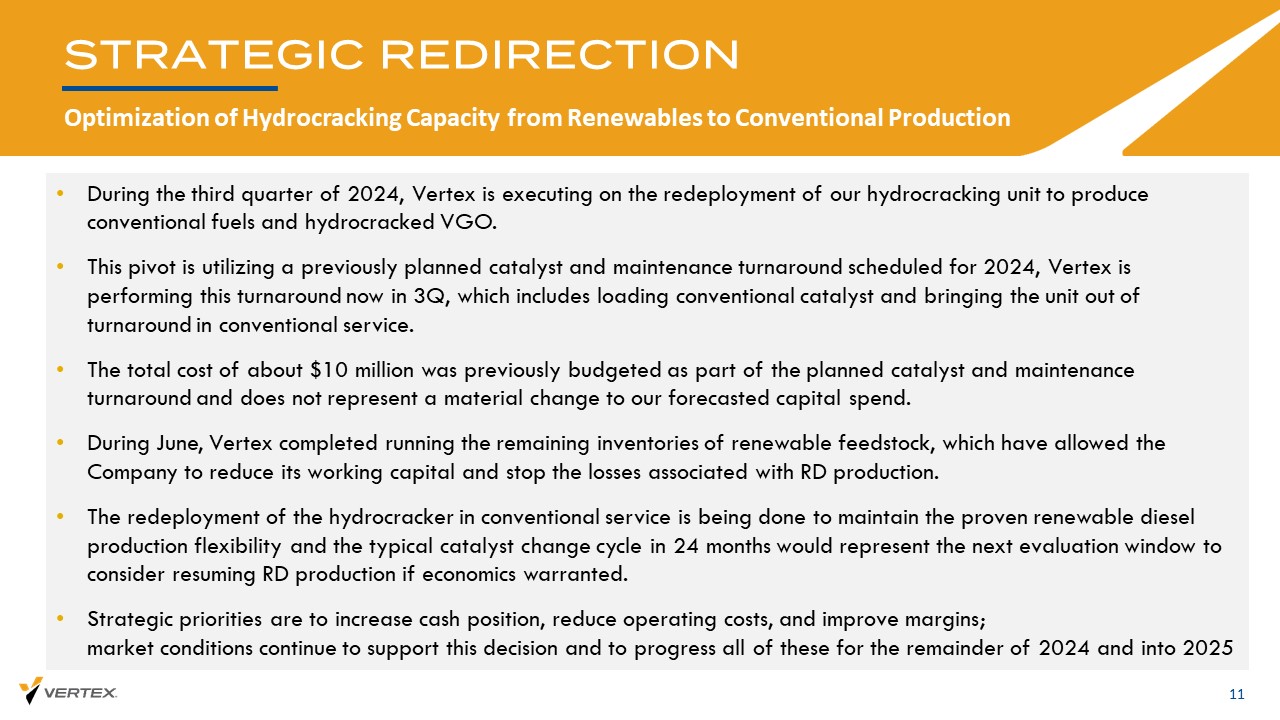我们的战略重点10资产利用•移动炼油厂的灵活生产提高了长期价值•持续对旨在推动移动炼油厂盈利的机会进行战略评估•位于墨西哥湾沿岸相邻市场的互补资产利润率资本化•移动炼油厂充当常规燃料的关键区域供应商•将重新部署的可再生加氢裂化装置对于常规用途•重新部署预计将增加常规燃料利润率机会可再生投资•在移动炼油厂展示了经过验证的可再生燃料能力•可再生投资增强了可再生或常规服务模式下的单位稳健性• CI *路径批准预计将释放利润率机会加强资产负债表•减少总债务优先考虑高息定期贷款和剩余可转换票据•评估资产负债表改善的替代方案忠于我们作为能源转型公司的DNA,同时继续经营/运营我们的资产* CI是碳强度。CI评分是分配给一蒲式耳谷物、生物燃料或其他产品的碳足迹评分。该分数与生产单位挂钩,用于量化公司或产品的总碳足迹