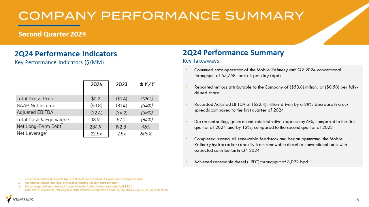 2024 HIGHLIGHTS 4 Health and Safety Performance • Mobile Refinery在2024年第二季度有1起OSHA可记录的伤害,1起环境不合规事件,以及以运营成本和资本管理为重点的零过程安全事件•与2024年第一季度相比,销售、一般和管理费用减少了6%,与2023年第二季度相比减少了12% •与之前的指导中点管理近期流动性相比,资本支出减少了29% •如之前披露的那样,获得了1500万美元和2000万美元的新贷款,增强公司流动性•修改了当前定期贷款协议的某些条款和条件,并任命Seth Bullock为公司可再生业务的首席重组官生产暂停和Pivot •优化从可再生柴油到常规燃料的移动炼油厂加氢裂化装置产能•完成所有可再生原料的运行,并开始优化从可再生柴油到常规燃料的移动炼油厂加氢裂化装置产能,预计将在2024年第四季度做出贡献