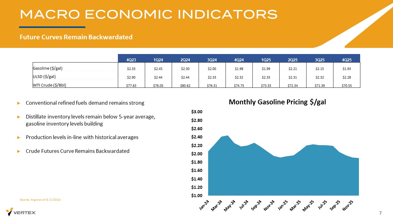 未来曲线保持向后值7个宏观经济指标来源:Argus截至2024年8月2日丨常规精炼燃料需求依然强劲↓馏分油库存水平仍低于5年平均水平,汽油库存水平正在建立丨产量水平-与历史平均水平一致↓原油期货曲线保持向后回调$ 1.00 $ 1.20 $ 1.40 $ 1.60 $ 1.80 $ 2.00 $ 2.20 $ 2.40 $ 2.60 $ 2.80 $ 3.00每月汽油定价$/gal 4Q25 3Q25 2Q25 1Q25 4Q24 3Q24 2Q24 1Q24 4Q23 $ 1.93 $ 2.15 $ 2.21 $ 1.99 $ 1.98 $ 2.00 $ 2.30 $ 2.45 $ 2.33汽油($/gal)$ 2.28 $ 2.32 $ 2.31 $ 2.33 $ 2.32 $ 2.33 $ 2.44 $ 2.44 $ 2.90 ULSD($/gal)$ 70.55 $ 71.39 $ 72.34 $ 73.33 $ 74.75 $ 76.31 $ 80.62 $ 76.05 $ 77.63 WTI原油(美元/桶