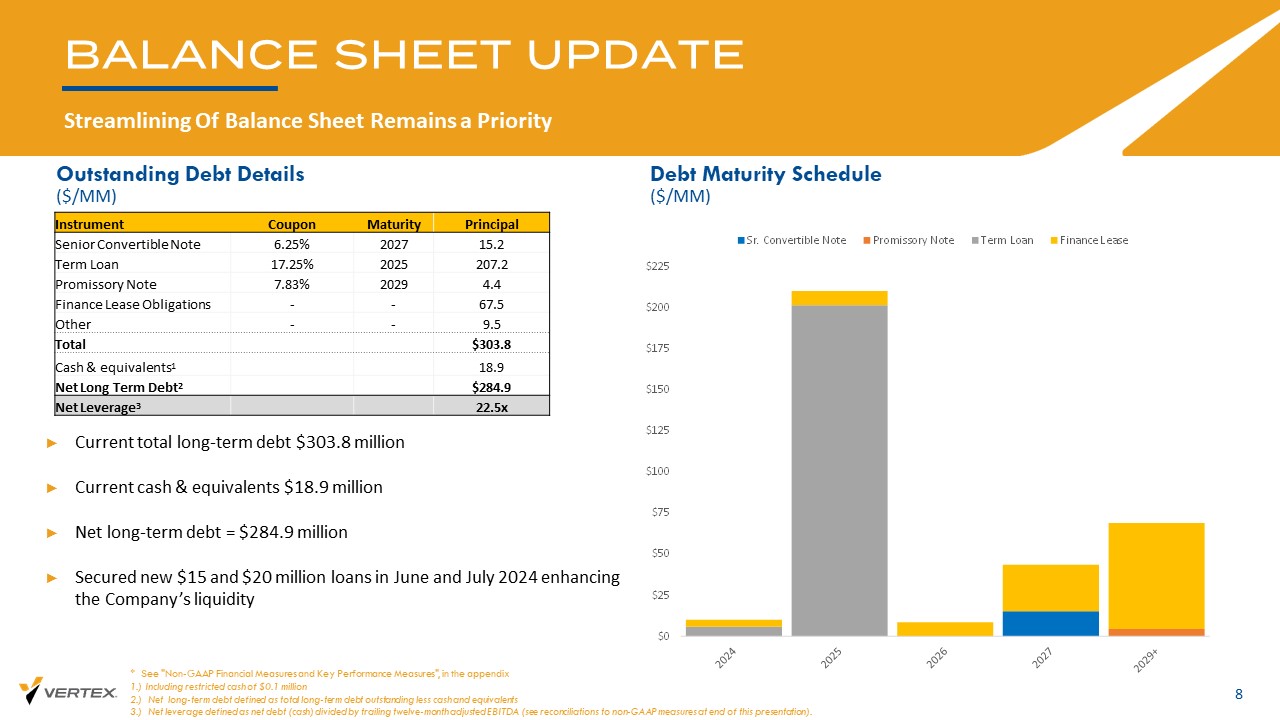资产负债表更新精简资产负债表仍为优先级8未偿债务详情($/mm)债务到期时间表($/mm)丨当前长期债务总额3.038亿美元丨当前现金及等价物1890万美元丨净长期债务= 2.849亿美元丨2024年6月和7月获得新的15美元和2000万美元贷款,增强公司流动性*见“非公认会计准则财务指标和关键绩效指标”,附录1.)包括限制性现金10万美元2.)净长期债务定义为未偿长期债务总额减去现金和等价物3.)净杠杆定义为净债务(现金)除以过去12个月调整后EBITDA(见本演示文稿末尾与非GAAP m easures的对账)。本金到期日票息工具15.2 20276.25%优先可转换票据207.2 202517.25%定期贷款4.420297.83%本票67.5--融资租赁义务9.5--其他303.8美元合计18.9现金及等价物1 $ 284.9净长期债务2 22.5x净杠杆3 $ 0 $ 25 $ 50 $ 75 $ 100 $ 125 $ 150 $ 175 $ 200 $ 225 Sr.可转换票据本票定期贷款融资租赁