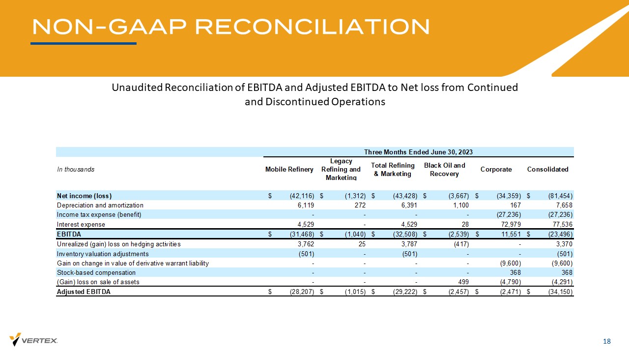 非公认会计原则对账17未经审计的EBITDA和调整后EBITDA与持续经营和终止经营净亏损的对账以千为单位常规可再生能源净收入(亏损)$(13,046)$(23,438)$ 914 $(35,570)$(1,405)$(16,870)$(53,845)折旧及摊销3,7543,954527,7601,7402389,738所得税费用(收益)------利息费用2,7172,636-5,35314112,23117,725 EBITDA $(6,575)$(16,848)$ 966 $(22,457)$ 476 $(4,401)$(26,382)未实现(收益)套期保值活动损失353(302)-51(42)-9存货估值调整3,2332,524-5,757--5,757衍生权证负债价值变动收益------(1,680)(1,680)股票补偿----430430(收益)资产出售损失-----(8)(8)其他----56(568)(512)调整后EBITDA $(2,988)$(14,626)$ 966 $(16,649)$ 490 $(6,227)$(22,386)截至2024年6月30日的三个月移动炼油厂Legacy Refining & Marketing Total Refining & Marketing Black Oil and Recovery Corporate Consolidated