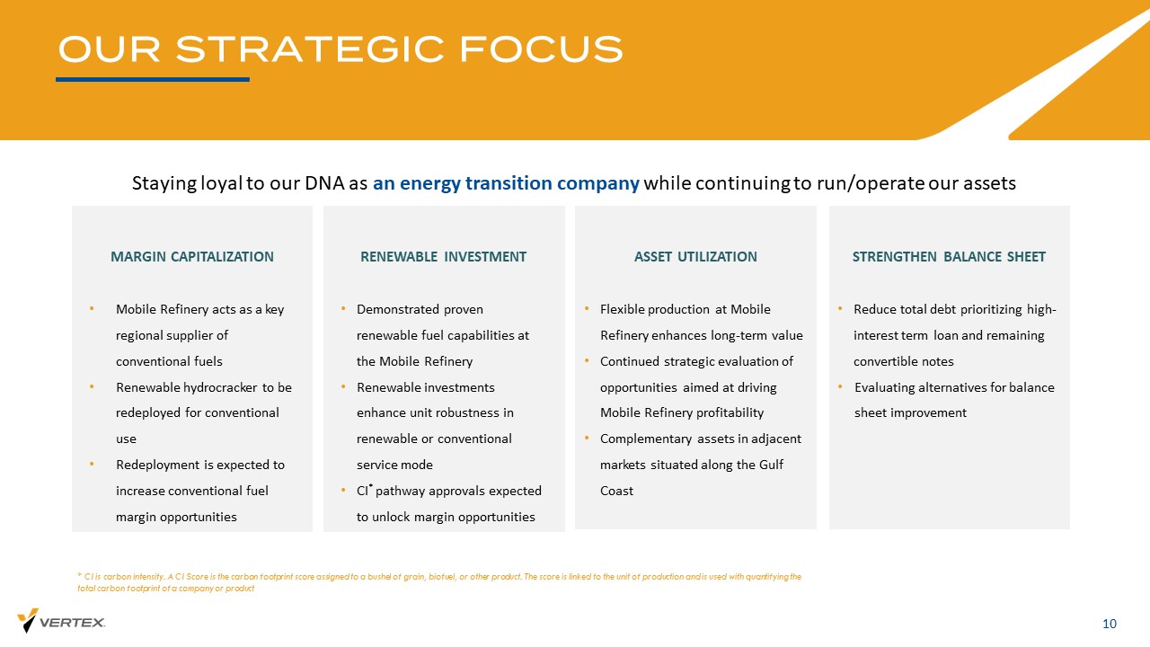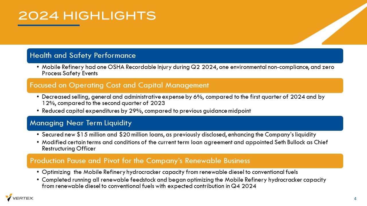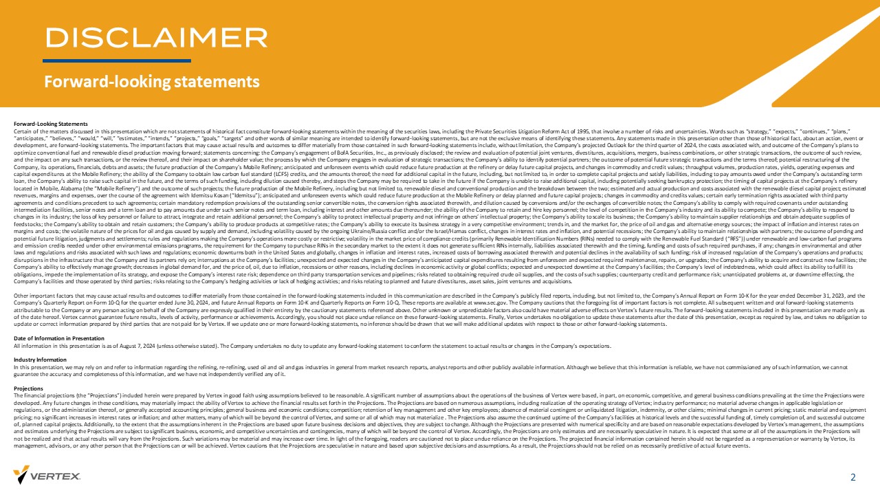 免责声明前瞻性陈述2前瞻性陈述本演示文稿中讨论的某些不属于历史事实陈述的事项构成证券法含义内的前瞻性陈述,包括1995年《私人证券诉讼改革法案》,其中包含一些风险和不确定性。“战略”、“预期”、“继续”、“计划”、“预期”、“相信”、“将”、“将”、“估计”、“打算”、“项目”、“目标”等类似词语旨在识别前瞻性陈述,但不是识别这些陈述的唯一方式。本演示文稿中除历史事实之外的任何有关某一行动、事件或发展的陈述,均为前瞻性陈述。可能导致实际结果和结果与此类前瞻性陈述中包含的结果和结果存在重大差异的重要因素包括但不限于公司对2024年第三季度的预计展望、与公司未来优化常规燃料和可再生柴油生产计划相关的成本和结果;有关以下方面的陈述:公司聘用BoFA Securities,Inc.,如先前所披露;对潜在合资企业、资产剥离、收购、M ergers、业务合并或其他战略交易的审查和评估,此类审查的结果,以及对任何此类交易的影响,或其审查,及其对股东价值的影响;该公司从事战略交易评估的过程;该公司识别潜在合作伙伴的能力;初步未来战略交易的结果及其条款;该公司、其运营、财务、债务和资产的潜在重组;该公司移动炼油厂的未来生产;预计将发生可能减少炼油厂未来产量或推迟未来资本项目的事件,以及商品质量和信用价值的变化;吞吐量、生产率、产量、移动炼油厂的运营费用和资本支出;公司获得低碳燃料标准(LCFS)信用额度的能力,及其金额;未来对额外资本的需求,包括但不限于为了完成人均l p rojects和清偿债务,包括支付公司未偿还定期贷款项下的欠款,公司未来筹集此类资本的能力,以及此类融资的条款,包括稀释导致reb y,以及如果公司无法筹集额外资金,公司未来可能被要求采取的步骤,包括g p先前寻求破产保护;公司位于阿拉巴马州莫比尔的炼油厂(“Mobile炼油厂”)的资本项目的时间安排以及此类项目的结果;Mobile Refi ner y的未来生产,包括但不限于可再生柴油和常规生产以及两者之间的细分;估计a d a与可再生柴油资本项目相关的实际产量和成本;估计收入、利润率和费用,在与Idemitsu Kosan(“Idemitsu”)的协议过程中;可能减少Mobile Refinery未来产量或推迟计划和未来CA Pital项目的预期和不可预见事件;商品和信用价值的变化;与第三方协议相关的某些提前终止权以及此类协议的先决条件;未偿还的优先可转换票据的某些强制赎回条款、与之相关的转换权,以及转换和/或兑换可转换票据导致的稀释;公司在未偿还的中介设施下遵守所需契约的能力,优先票据和定期贷款以及支付此类优先票据和定期贷款项下到期的金额,包括ng利息和其他项下到期的金额;公司留住和聘用关键人员的能力;公司所处行业的竞争水平及其竞争能力;公司应对所在行业变化的能力;关键人员流失或未能吸引,整合和保留更多人员;竞争对手任何保护知识产权和不侵犯他人知识产权的能力;公司扩大业务规模的能力;公司维持供应商关系和获得充足原料供应的能力;公司获得和留住客户的能力;公司以具有竞争力的价格生产产品的能力;公司在竞争非常激烈的环境中执行其业务战略的能力;趋势,以及市场, 石油和天然气及替代能源的经济收益;通货膨胀和利率对利润率和成本的影响;供需造成的石油和天然气价格的波动性,包括持续的乌克兰/俄罗斯冲突和/或以色列/哈马斯冲突造成的波动性、利率和通货膨胀的变化以及潜在的重新割让;公司与合作伙伴保持关系的能力;未决诉讼和未来潜在诉讼的结果,判决和和解;使公司运营成本更高或变得更加复杂的规章制度;可再生和低碳燃料计划下的合规信用(主要是与可再生燃料标准(“RFS”)兼容所需的可再生识别号(RIN))和其他环境排放计划下所需的排放信用)的市场价格波动,要求公司在内部没有产生足够的RIN的情况下在二级市场购买RIN,与之相关的负债以及此类所需购买的ti min g、资金和成本,如果有的话;环境和其他法律法规的变化以及与此类法律法规相关的风险;美国和gl oba lly的经济衰退、通货膨胀和利率的变化、与之相关的借贷成本增加以及此类资金的aV不适用性可能下降;对公司运营和产品加强监管的风险;公司及其合作伙伴所依赖的基础设施中断;公司设施的中断;由于不可预见和预期的要求而导致的公司预期资本支出的unexpect ed ed和预期变化,维修或升级;公司收购和建设新设施的能力;公司有效管理增长的能力;由于通货膨胀、rece ssi on或其他原因,包括经济活动下降或全球冲突,全球对石油的需求和价格下降;Co mpa ny设施的预期和意外停机;公司的负债水平,这可能会影响其履行义务的能力,阻碍其战略的实施,并暴露公司的利率风险;对第三部分Y T运输服务和管道的依赖;与获得所需的原油供应相关的风险,以及此类供应的成本;共同unterparty信用和履约风险;公司设施和第三方运营的设施出现意外问题或停机影响;与公司对冲活动或缺乏对冲ng活动相关的风险;以及与计划和未来的资产剥离、资产出售、合资和收购相关的风险。其他可能导致实际结果和结果与本通讯中包含的前瞻性陈述中包含的内容存在重大差异的重要因素在公司公开提交的报告中进行了描述,包括但不限于公司截至2023年12月31日止年度的10-K表格年度报告,以及公司截至2024年6月30日止季度的10-Q表格季度报告,以及未来的10-