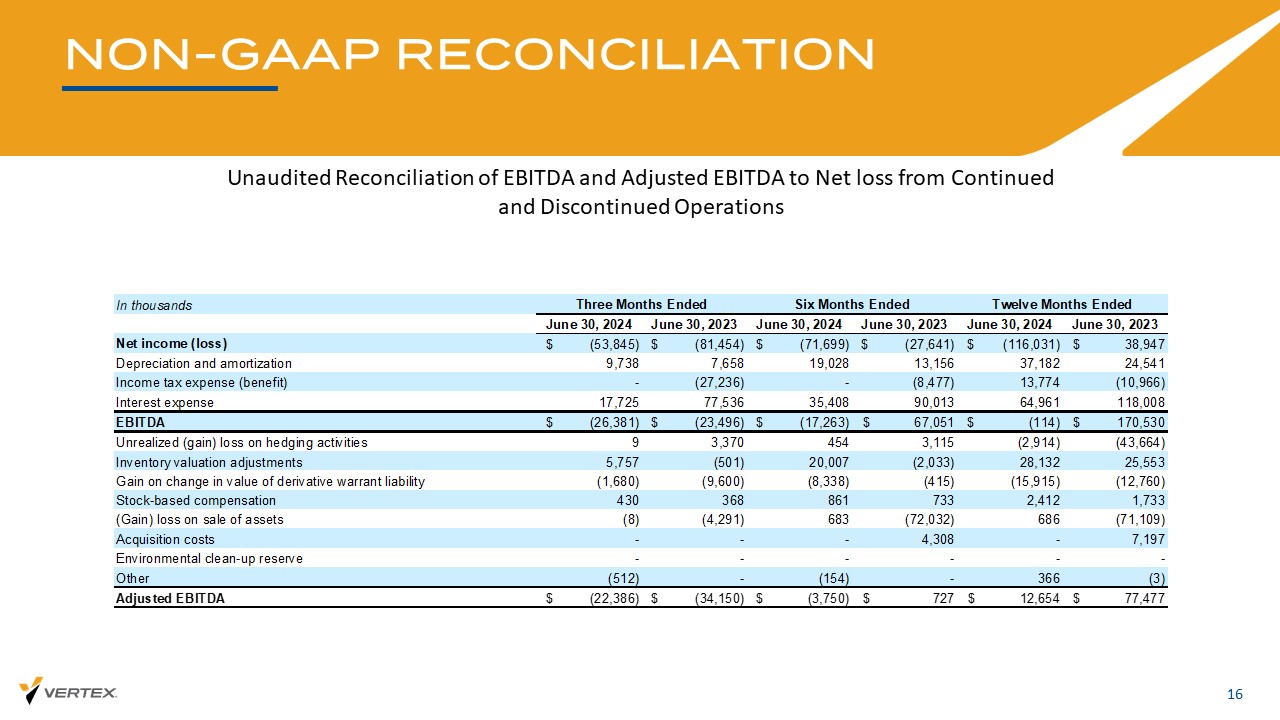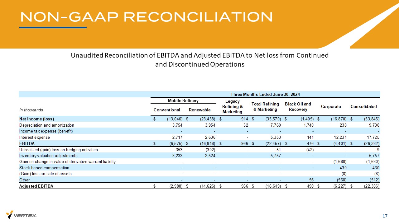 非公认会计原则对账16未经审计的EBITDA和调整后EBITDA与持续经营和终止经营净亏损的对账,以千计2024年6月30日2023年6月30日2024年6月30日2023年6月30日2023年6月30日2024年6月30日,2023净收益(亏损)$(53,845)$(81,454)$(71,699)$(27,641)$(116,031)$ 38,947折旧及摊销9,7387,65819,02813,15637,18224,541所得税费用(收益)-(27,236)-(8,477)13,774(10,966)利息费用17,72577,53635,40890,01364,961118,008 EBITDA $(26,381)$(23,496)$(17,263)$ 67,051 $(114)$ 170,530套期保值活动未实现(收益)损失93,3704543,115(2,914)(43,664)存货估值调整5,757(501)20,007(2,033)28,13225,553衍生权证负债价值变动收益(1,680)(9,600)(8,338)(415)(154,308-7,197环境清理准备金------其他(512)-(154)-366(3)调整后EBITDA $(22,386)$(34,150)$(3,750)$ 727 $ 12,654 $ 77,477三个月结束十二个月结束六个月结束
