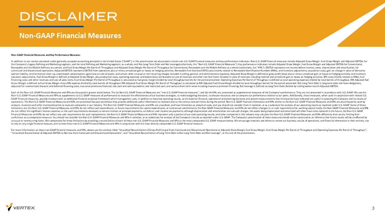 免责声明非美国通用会计准则财务指标3非美国通用会计准则财务指标和关键绩效指标除了我们根据美国公认会计原则(“GAAP”)计算的结果外,在这篇论文中,我们还介绍了某些非美国通用会计准则财务指标和关键绩效指标。非美国通用会计准则财务指标包括公司传统炼油和营销部门的调整后毛利率、燃料毛利率和调整后EBITDA,以及整个炼油和营销部门,以及净长期债务和净杠杆(统称为“非美国通用会计准则财务指标”)。关键业绩指标包括常规、可再生和移动炼油厂整体的调整后毛利率、燃料毛利率和调整后EBITDA,以及常规、可再生和移动炼油厂整体的每桶吞吐量燃料毛利率和每BARRR L吞吐量的调整后毛利率(统称为“KPI”)。EBITDA代表持续经营和终止经营业务的扣除利息、税项、折旧和摊销前的净收入。调整后的EBITDA是指来自运营的EBITDA加上或减去对冲活动的未实现收益或OS、可再生燃料标准(RFS)成本(主要与可再生识别号(RINS)相关,以及在ve分类调整中,购置成本、衍生权证负债价值变动收益、环境清理、基于股票的补偿、出售资产的(收益)损失,以及销售、一般和管理费用中包含的某些其他不寻常或非经常性费用。调整后的毛利率定义为毛利率(损失)加上或减去对冲活动和库存估值调整的未实现损益。燃料毛利率定义为调整后的毛利率,加上生产成本、运营费用和归属于收入成本的d epr eciation以及收入成本中包含的其他非燃料项目,包括对冲活动的已实现和未实现ed损益、RFS成本(主要与RIN相关)、燃料融资成本和其他收入和销售项目成本。每桶吞吐量的燃料毛利率计算为所示期间的燃料gro ss margin除以总吞吐量桶。每桶吞吐量的运营费用定义为d a s总运营费用除以总桶吞吐量。RIN调整后燃料毛利率定义为燃料毛利率减去RIN费用除以总吞吐量桶。每桶吞吐量的RIN调整后燃料总毛利M argin计算为RIN调整后燃料毛利率除以所述PE rio d的总吞吐量桶。净长期债务是长期债务和租赁义务,调整了未摊销的贴现和递延融资成本,保险费融资,减去现金和现金等价物和限制性现金,以及包括保险费融资在内的各种短期票据。净杠杆定义为长期债务d,由过去12个月的调整后EBITDA确定。下文将更详细地讨论每一项非美国通用会计准则财务指标和KPI。(a)非美国通用会计准则财务指标为“非美国通用会计准则财务指标”,(b)KPI为公司业绩的补充指标。它们不按照美国公认会计原则列报。我们使用非美国通用会计准则财务指标和KPI作为美国通用会计准则绩效指标的补充,以评估我们的业务战略的有效性,做出预算决策,分配资源并比较我们相对于我们的pee RS的绩效。此外,当与相关的美国公认会计原则财务措施一起使用时,这些措施为投资者提供了一个额外的财务分析框架,管理层在历史经营业绩的基础上使用该框架作为财务、运营和规划决策的基础,并提出了ird各方表示对评估公司及其经营业绩有用的衡量标准。之所以提出非美国通用会计准则财务指标和KPI,是因为我们认为,由于该期间的各种非现金项目,它们为投资者提供了额外的有用信息。非美国通用会计准则财务信息和与非美国通用会计准则财务指标和KPI类似的KPI也经常被分析师、投资者和其他感兴趣的各方用来评估我们行业中的公司。非美国通用会计准则财务指标和KPI未经审计,作为分析工具存在局限性,您不应孤立地考虑它们,或将其作为我们根据美国通用会计准则报告的经营业绩分析的替代品。其中一些限制是:非美国通用会计准则财务指标和KPI不反映现金支出,或未来对资本支出的要求, 或合同承诺;非美国通用会计准则财务指标和KPI不反映营运资金需求的变化或现金要求;非美国通用会计准则财务指标和KPI不反映重大利息支出,或偿付利息或本金、偿还债务或现金所得税所需的现金需求;虽然折旧和摊销是非现金费用,但被折旧和摊销的资产在未来往往不得不被替换,非美国通用会计准则财务指标和KPI未反映此类替代的任何现金需求;非美国通用会计准则财务指标和KPI仅代表我们总经营业绩的一部分;而该行业的其他公司计算非美国G AAP财务指标和KPI的方式可能与我们不同,从而限制了它们作为比较指标的有用性。您不应孤立地考虑非美国公认会计原则财务指标和KPI,或作为根据美国公认会计原则报告的公司业绩分析的替代品。公司对这些措施的表述不应被解释为未来业绩将不受不寻常或非经常性项目影响的推断。我们通过提供这些非美国公认会计原则财务指标和KPI与下文最具可比性的美国公认会计原则指标的对账来弥补这些限制。我们鼓励投资者和其他人完整地审查我们的b usi、运营结果和财务信息,而不是依赖任何单一的财务指标,并结合MOS t直接可比的美国GAAP财务指标来查看这些非美国GAAP财务指标和KPI。有关这些非GAAP财务指标和KPI的更多信息,请参阅本演示文稿末尾标题为“持续和终止经营业务的毛利润(亏损)与调整后毛利率、燃料毛利率、燃料毛利率每桶吞吐量和每桶吞吐量的运营费用的未经审计对账”、“调整后EBITDA与持续和终止经营业务净亏损的未经审计对账”、“长期债务与净长期债务和净杠杆的未经审计对账”的章节。