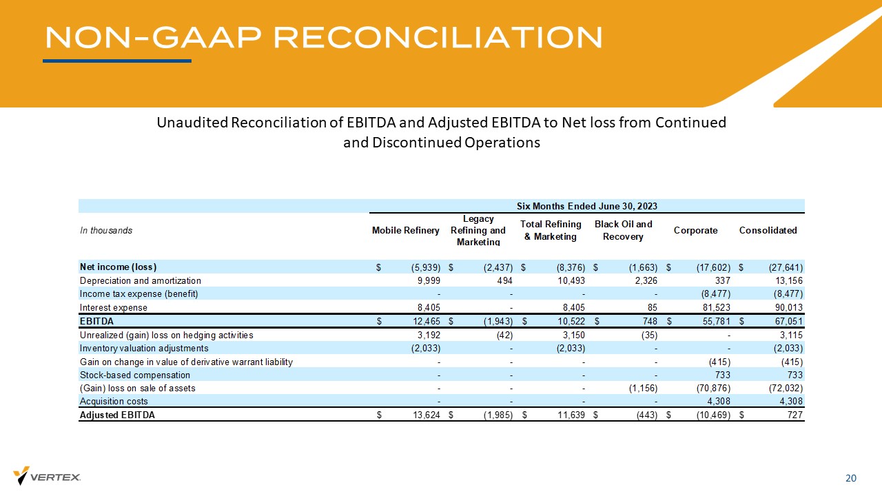 非公认会计准则对账19未经审计的EBITDA和调整后EBITDA与持续经营和终止经营净亏损的对账(以千为单位)常规可再生能源净收入(亏损)$ 4,492 $(45,596)$ 1,354 $(39,750)$(415)$(31,534)$(71,699)折旧及摊销7,0847,90710215,0933,45847719,028所得税费用(收益)------利息费用5,1724,928-10,10023725,07135,408 EBITDA $ 16,748 $(32,761)$ 1,456 $(14,557)$ 3,280 $(5,986)$(17,263)套期保值活动未实现(收益)损失(202)632204504-454存货估值调整12,8907,117-20,007--20,007衍生权证负债价值变动收益-----(8,338)(8,338)股票补偿----861861(收益)资产出售损失685--6855(7)683其他----410(564)(154)调整后EBITDA $ 30,121 $(25,013)$ 1,476 $ 6,585 $ 3,699 $(14,034)$(3,750)截至2024年6月30日的六个月移动炼油厂Legacy Refining & Marketing Total Refining & Marketing Black Oil and Recovery Corporate Consolidated