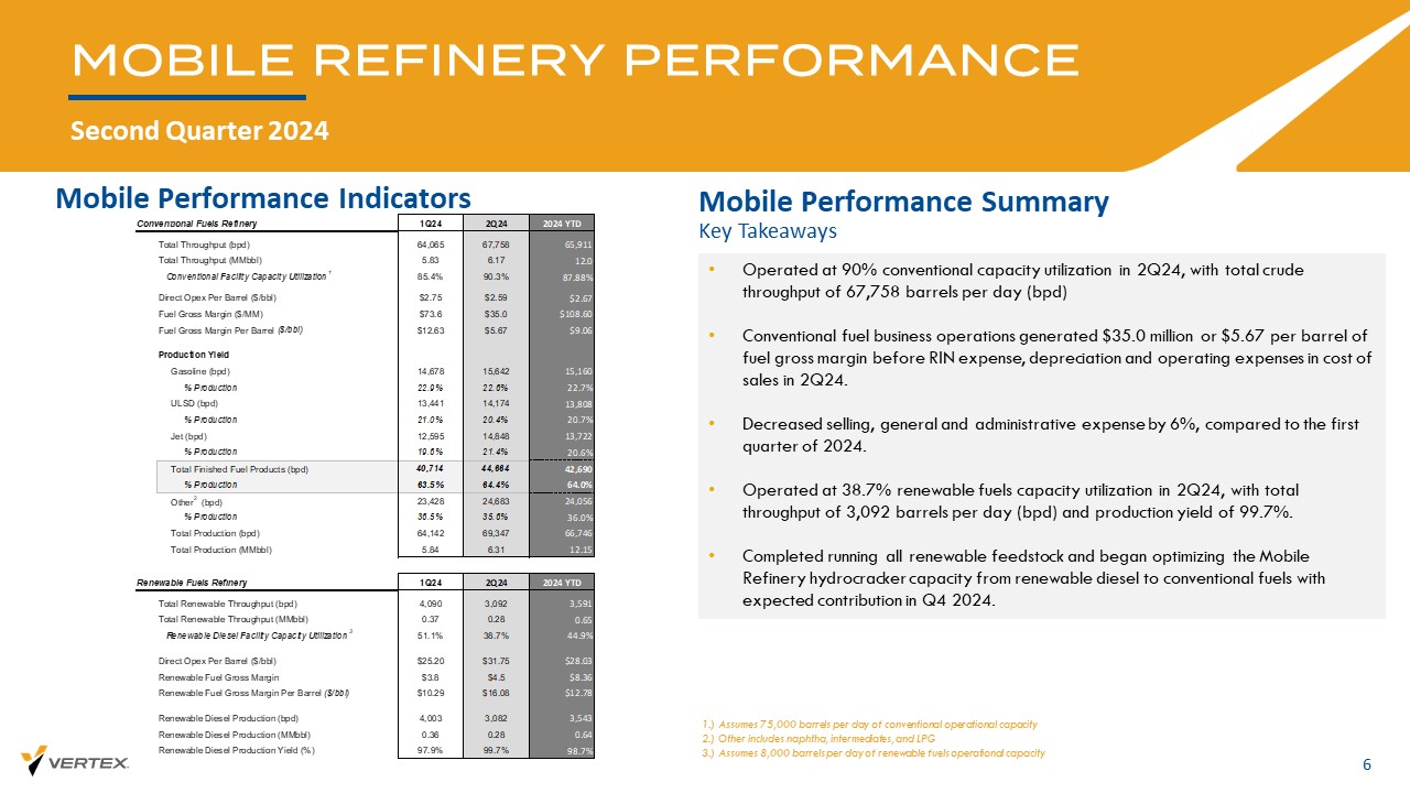 2Q24业绩指标公司业绩摘要2024年第二季度51。本演示文稿2的附录提供了GAAP与Non-GAAP指标的完全对账。净债务定义为未偿长期债务总额减去现金和等价物3。净杠杆定义为净债务(现金)除以过去12个月调整后EBITDA *截至2024年6月30日和2023年6月30日的总现金及等价物、净长期债务和净杠杆,分别为关键绩效指标(美元/毫米)关键要点2Q24业绩摘要•移动炼油厂继续安全运营,2024年第二季度常规吞吐量为67,758桶/天(桶/日)•报告的归属于公司的净亏损为(53.8)百万美元,或每股完全稀释股份(0.58美元)•与2024年第一季度相比,由于裂解价差下降28%,录得调整后EBITDA为(22.4)百万美元•与2024年第一季度相比,销售、一般和管理费用下降6%,与2023年第二季度相比下降12% •完成所有可再生原料的运行,并开始优化从可再生柴油到常规燃料的移动炼油厂加氢裂化装置产能,预计将在2024年第四季度做出贡献•实现可再生柴油(“RD”)吞吐量3092桶/日。2Q24 2Q23 % Y/Y总毛利$ 0.2($ 1.4)(118%)GAAP净收入(53.8)(81.4)(34%)调整后EBITDA 1(22.4)(34.2)(34%)总现金及等价物18.95 2.1(64%)净长期债务2284.9 192.848%净杠杆3 22.5x 2.5x 805%