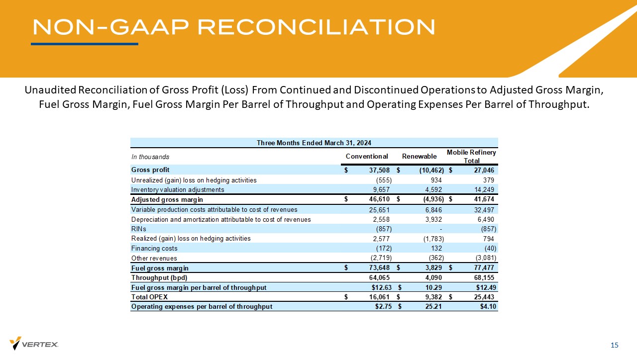 非公认会计准则对账14持续经营和终止经营业务的毛利润(亏损)与调整后毛利率、燃料毛利率、每桶吞吐量燃料毛利率和每桶吞吐量运营费用的未经审计对账。以千为单位常规可再生移动炼油厂总毛利润43,917美元(22,310)21,607美元套期保值活动未实现(收益)损失(202)632430存货估值调整12,8907,11720,007调整后毛利率56,605美元(14,561)42,044美元归属于收入成本的可变生产成本45,32219,02964,351折旧归属于收入成本的摊销5,5187,86513,383 RINS 8,242-8,242对冲活动已实现(收益)损失2,521(1,625)896融资成本(4,569)217(4,352)其他收入(5,015)(2,570)(7,585)燃料毛利率108,624美元8,355美元116,979美元吞吐量(桶/日)65,9113,59169,502每桶吞吐量的燃料毛利率9.06美元12.78美元9.25总运营支出32,002美元18,316美元50,319美元每桶吞吐量的运营费用2.67 28.03美元3.98美元截至2024年6月30日的六个月