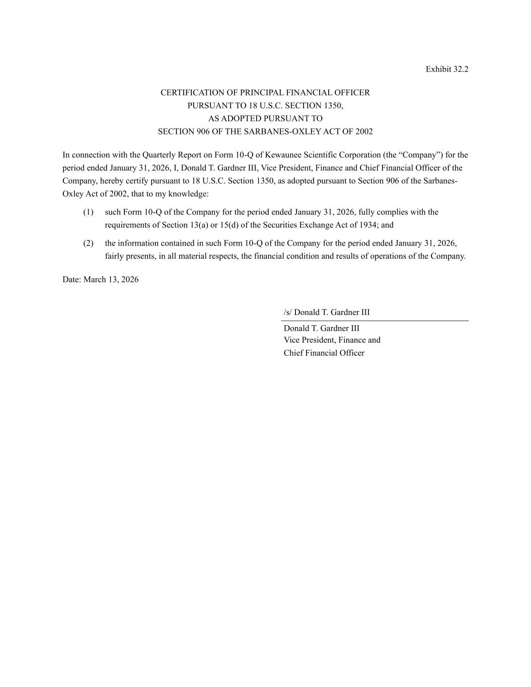 附件 32.2根据2002年《萨尔班斯-奥克斯利法案》第906条通过的《美国法典》第18条第1350款对截至2026年1月31日止期间丨科沃尼科学公司Kewaunee Scientific Corporation(“公司”)表格10-Q季度报告的首席财务官认证,我,公司财务副总裁兼首席财务官Donald T. Gardner III,特此根据18 U.S.C.第1350条,根据2002年《萨班斯-奥克斯利法案》第906条通过,据我所知:(1)该公司截至2026年1月31日止期间的该等表格10-Q完全符合《1934年证券交易法》第13(a)或15(d)条的规定;及(2)该公司截至2026年1月31日止期间的该等表格10-Q所载资料,在所有重大方面公平地反映了该公司的财务状况和经营业绩。日期:2026年3月13日/s/Donald T. Gardner IIIDonald T. Gardner III财务副总裁兼首席财务官
