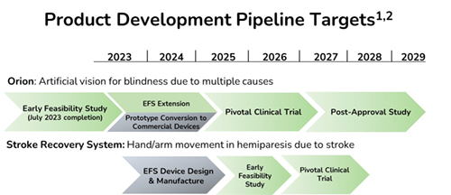 与Orion一样,中风恢复系统将需要颅骨手术;在这种情况下,将电极阵列放置在运动皮层上。我们从2022年开始设计中风系统,并在2023年2月研究了我们认为在尸体运动皮层上的最佳阵列位置。我们已经提交了NIH拨款申请,以寻求非稀释性资金来支持这个项目。此外,在2023年2月,我们与FDA工作人员举行了一次提交前会议(“Pre-Sub”),讨论开始对中风恢复系统进行早期可行性研究。我们在2023年4月申请了脑卒中恢复系统的突破性设备称号。如果我们未能获得这一称号,我们可能会遇到与FDA互动较慢的情况,这可能会推迟我们预计的开发时间表。