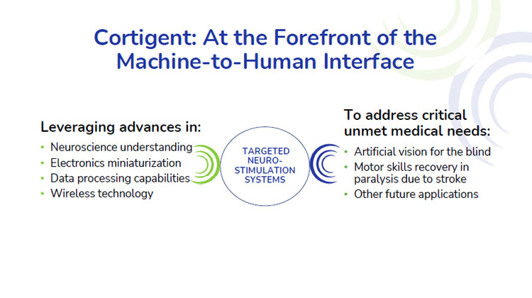 Cortigent:At the Forefront of the Machine-to-Human Interface Leveraging advances in:• Neuroscience understanding • Electronics miniatrification • Data processing capabilities • Wireless technology TARGETED NEURO-STIMULATION SYSTEMS To meet critical unmet medical needs:• Artificial vision for the blind • Motor skill